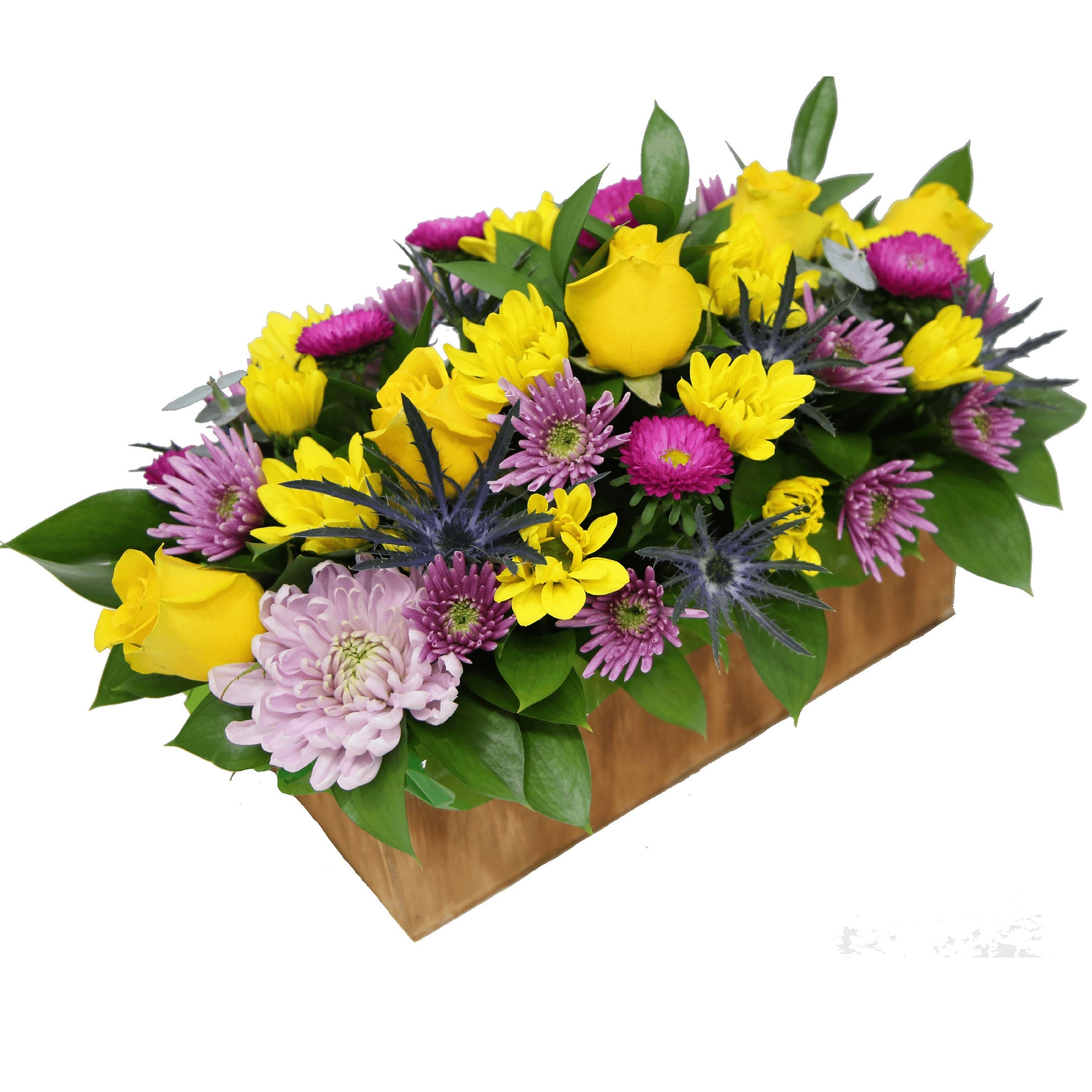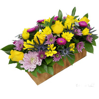5 Roses, 2 Disbuds, 5 Eryngium, 12 Daisy/Cushion, 12 Buttons Poms, 6 Mini Carnation, 2 Eucalyptus, 10 Ruscus, Wood Container (Natural/White/Brown/Gray Wash paint) with Liner.