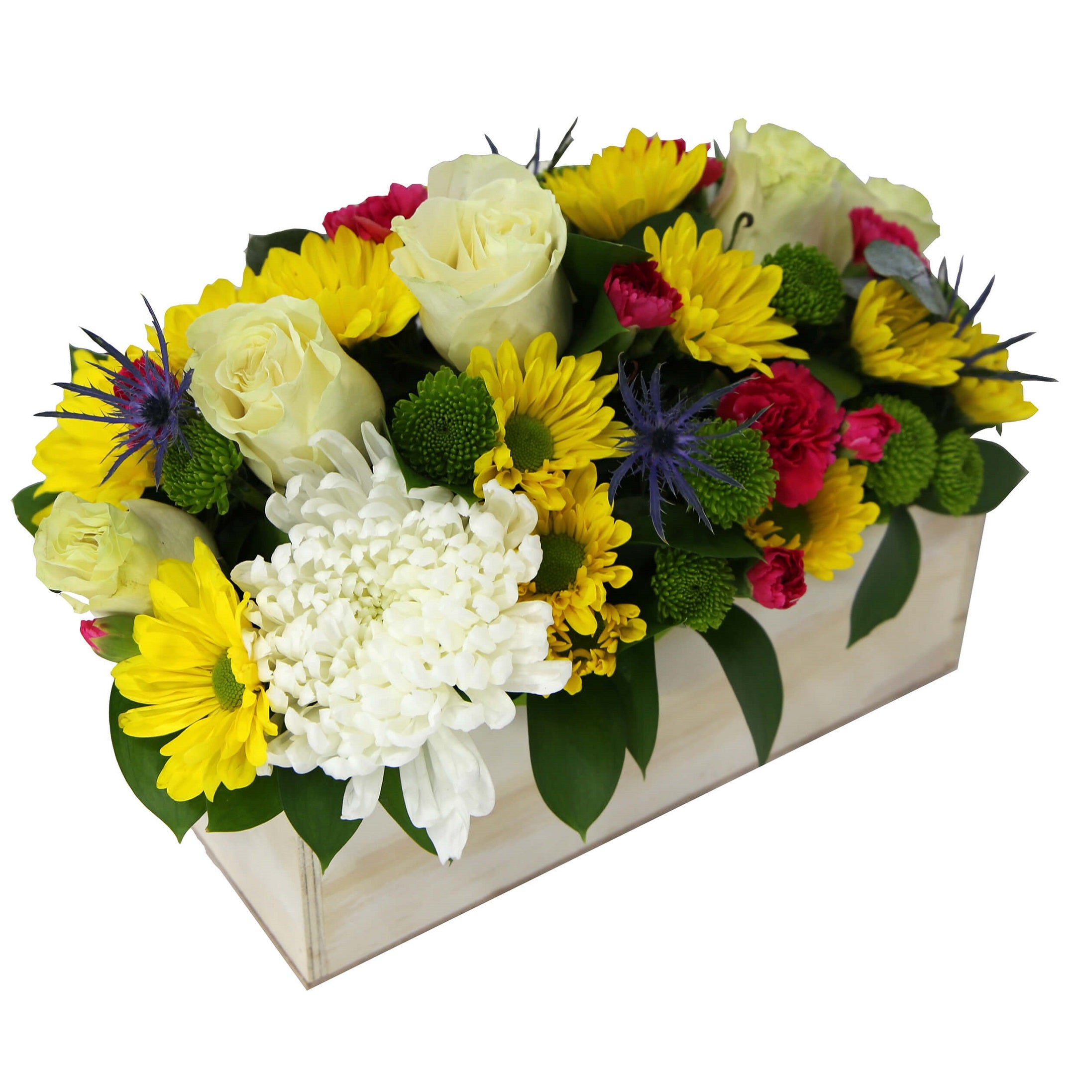 5 Roses, 2 Disbuds, 5 Eryngium, 12 Daisy/Cushion, 12 Buttons Poms, 6 Mini Carnation, 2 Eucalyptus, 10 Ruscus, Wood Container (Natural/White/Brown/Gray Wash paint) with Liner.