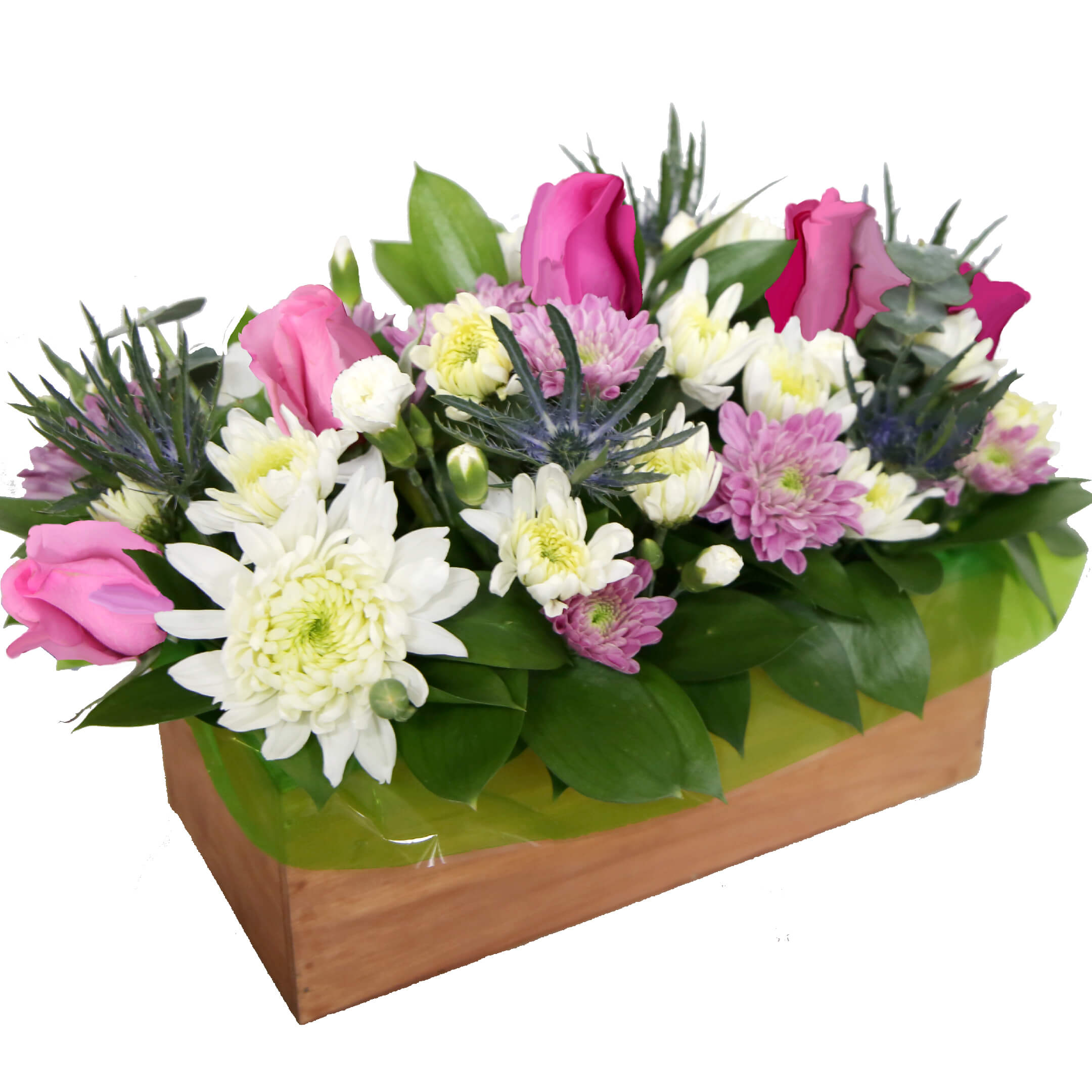 5 Roses, 2 Disbuds, 5 Eryngium, 12 Daisy/Cushion, 12 Buttons Poms, 6 Mini Carnation, 2 Eucalyptus, 10 Ruscus, Wood Container (Natural/White/Brown/Gray Wash paint) with Liner.
