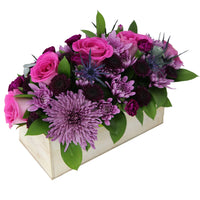 5 Roses, 2 Disbuds, 5 Eryngium, 12 Daisy/Cushion, 12 Buttons Poms, 6 Mini Carnation, 2 Eucalyptus, 10 Ruscus, Wood Container (Natural/White/Brown/Gray Wash paint) with Liner.