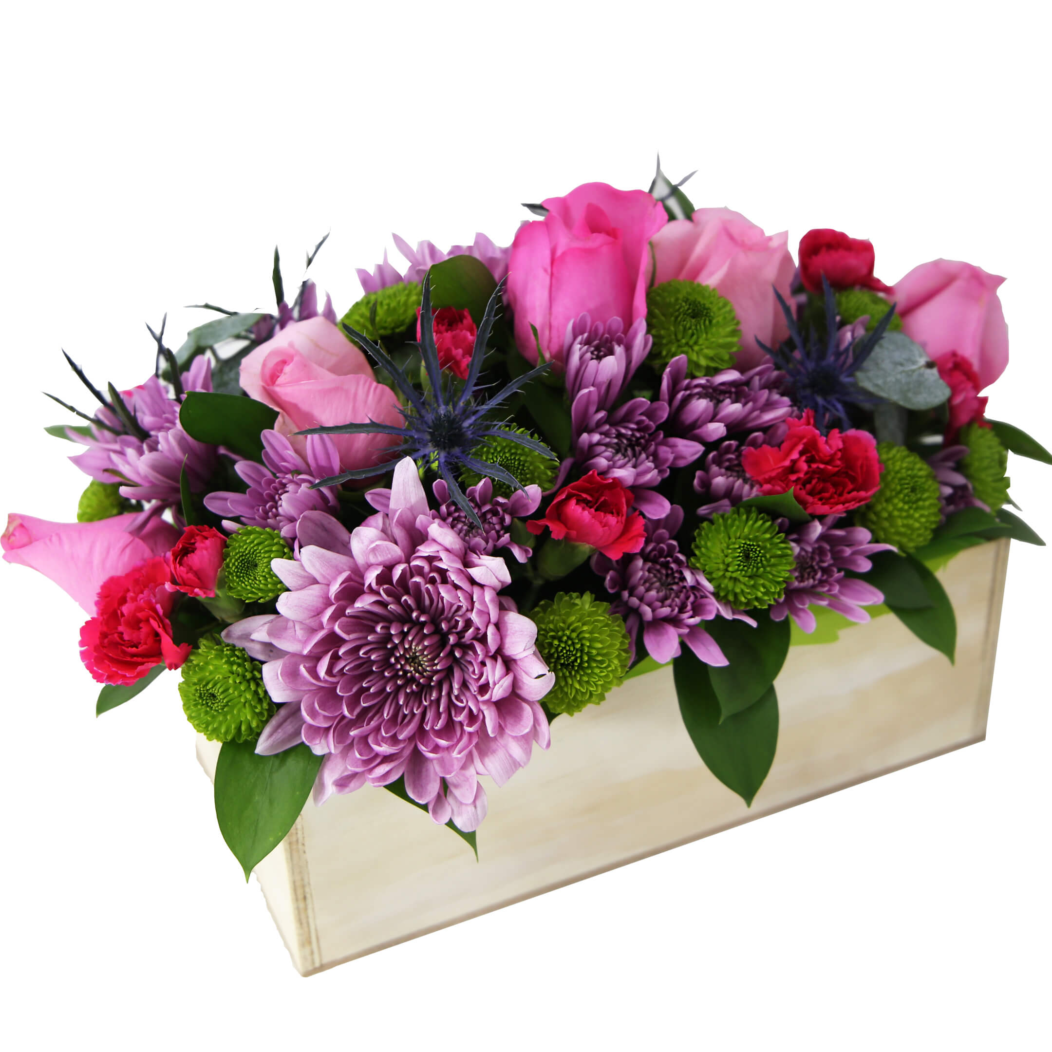 5 Roses, 2 Disbuds, 5 Eryngium, 12 Daisy/Cushion, 12 Buttons Poms, 6 Mini Carnation, 2 Eucalyptus, 10 Ruscus, Wood Container (Natural/White/Brown/Gray Wash paint) with Liner.