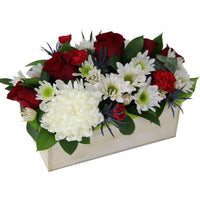 5 Roses, 2 Disbuds, 5 Eryngium, 12 Daisy/Cushion, 12 Buttons Poms, 6 Mini Carnation, 2 Eucalyptus, 10 Ruscus, Wood Container (Natural/White/Brown/Gray Wash paint) with Liner.