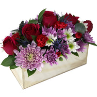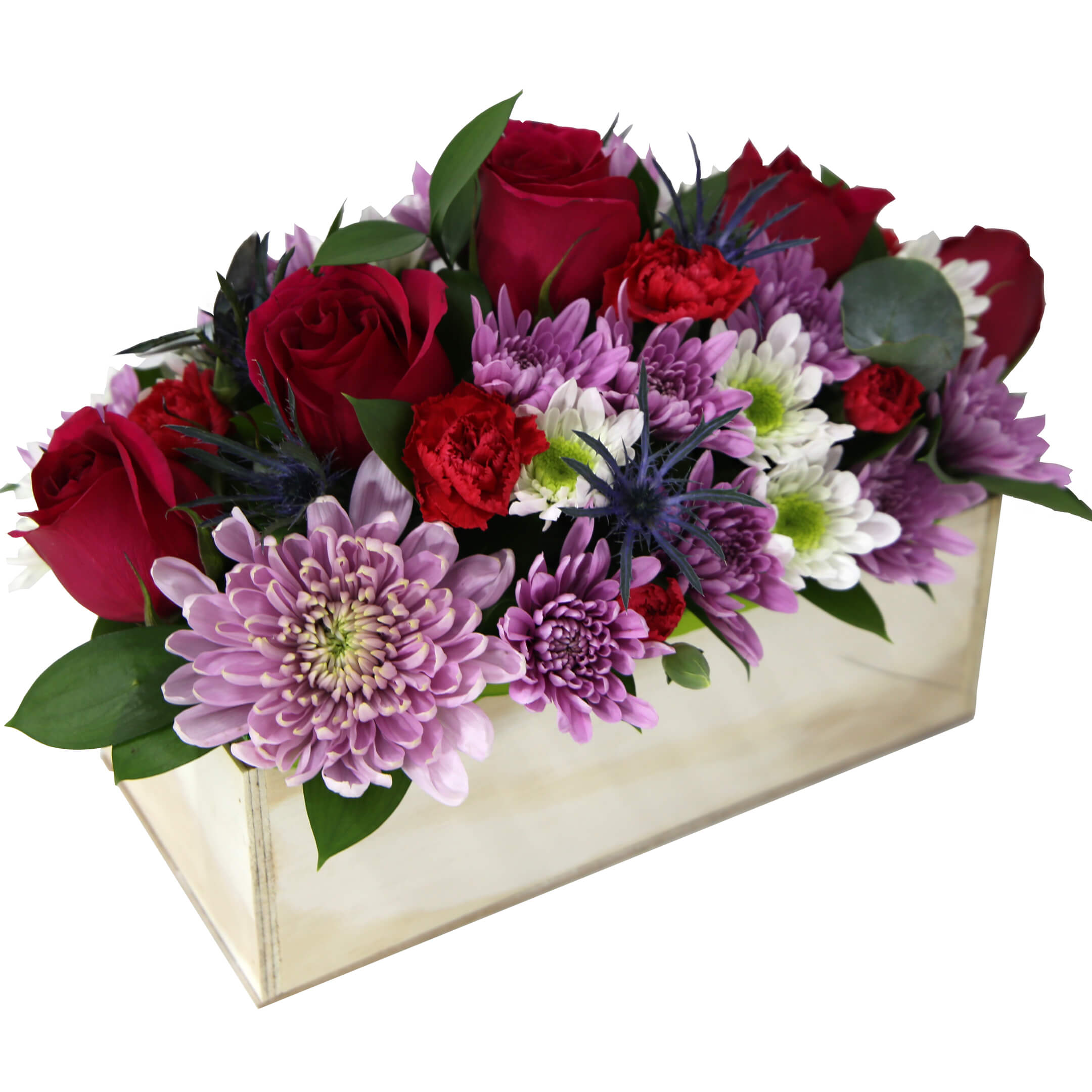 5 Roses, 2 Disbuds, 5 Eryngium, 12 Daisy/Cushion, 12 Buttons Poms, 6 Mini Carnation, 2 Eucalyptus, 10 Ruscus, Wood Container (Natural/White/Brown/Gray Wash paint) with Liner.