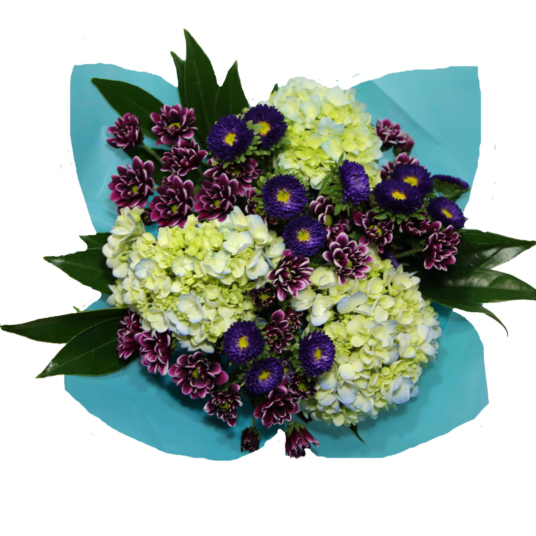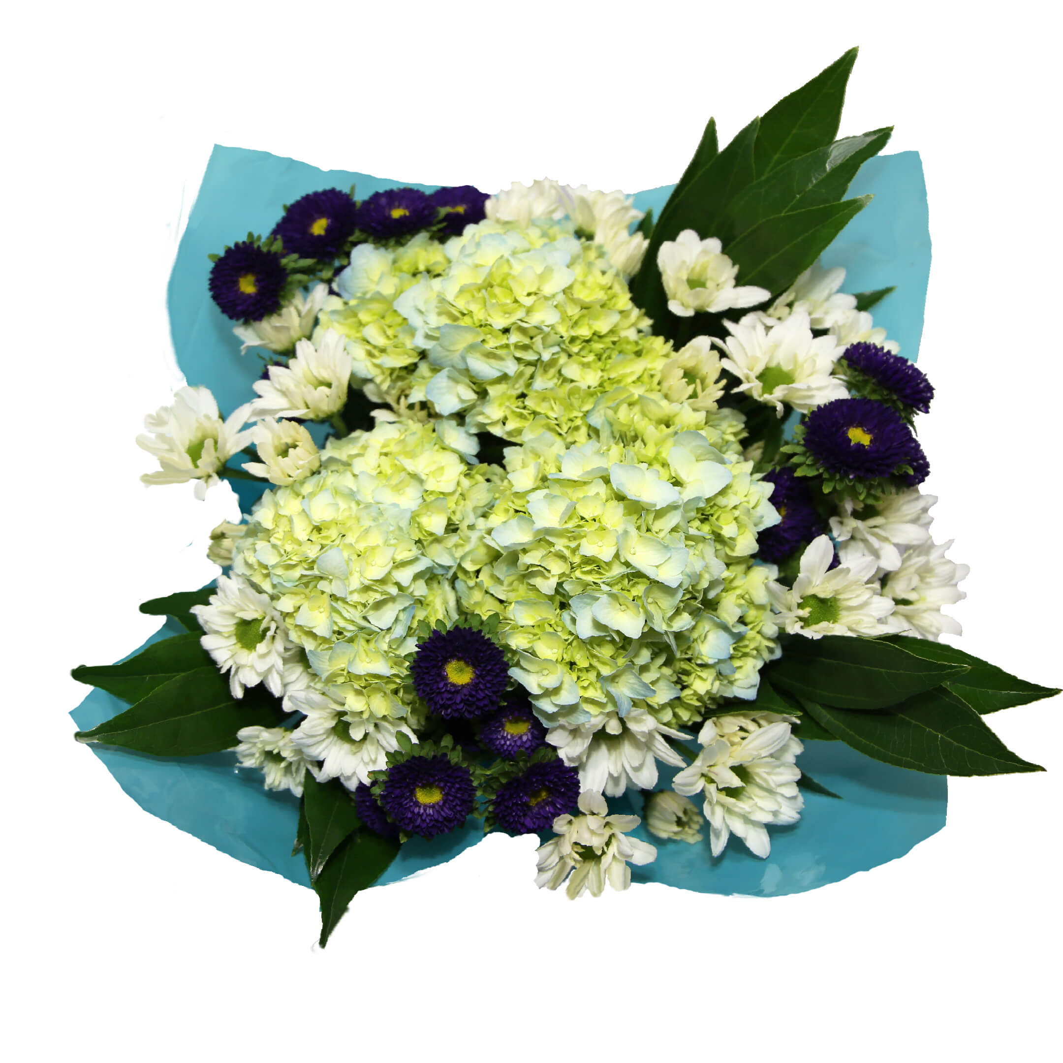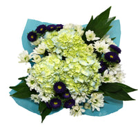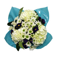 Beautiful mix of: 3 Hydrangeas, 3 Matsumoto/Alstroemeria/Mini Carnation/Statice/Dianthus, 6 Daisy Poms/3 Premium Greens. Clear sleeve+Wrap+Flower food+UPC