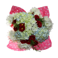Beautiful mix of: 3 Hydrangeas, 3 Matsumoto/Alstroemeria/Mini Carnation/Statice/Dianthus, 6 Daisy Poms/3 Premium Greens. Clear sleeve+Wrap+Flower food+UPC