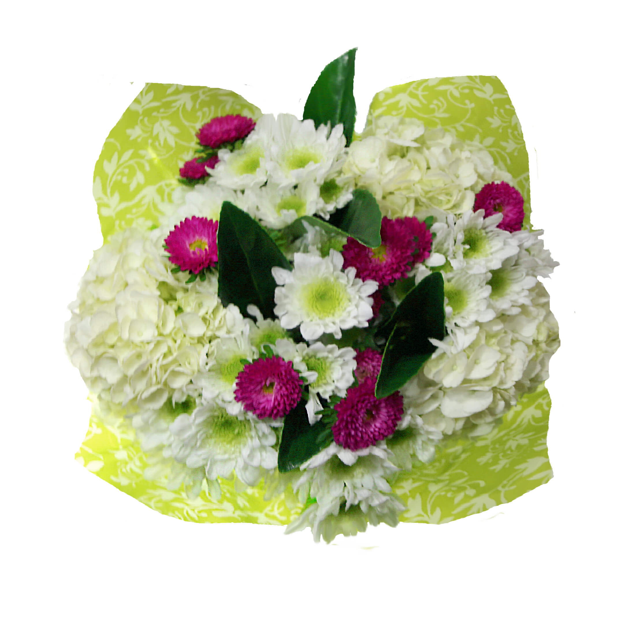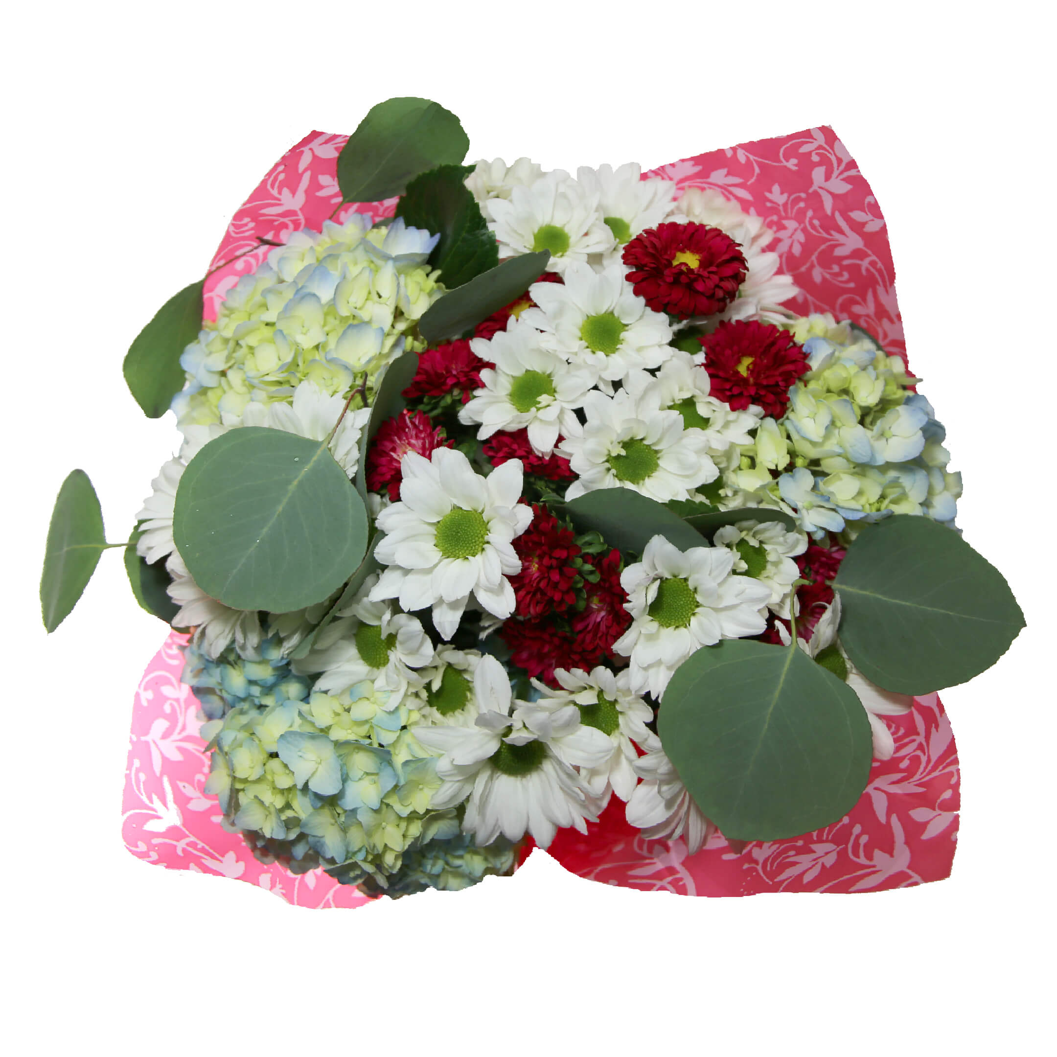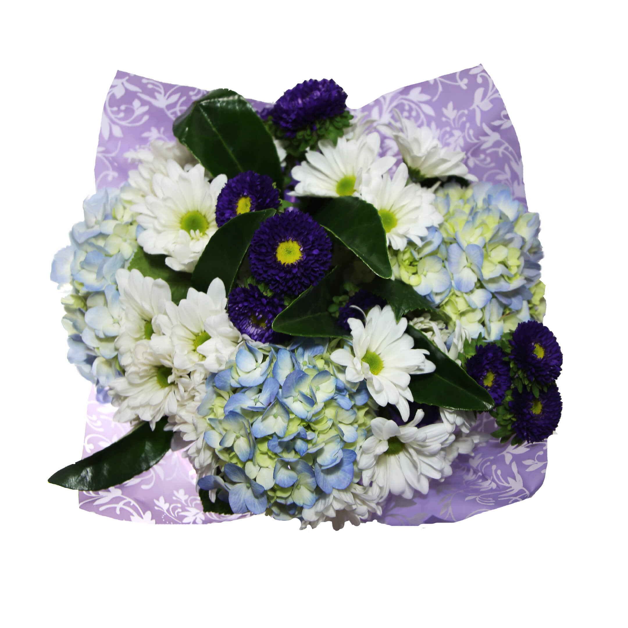 Beautiful mix of: 3 Hydrangeas, 3 Matsumoto/Alstroemeria/Mini Carnation/Statice/Dianthus, 6 Daisy Poms/3 Premium Greens. Clear sleeve+Wrap+Flower food+UPC