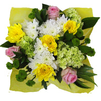 Beautiful mix of: 3 Mini Hydrangeas, 4 Disbuds, 3 Alstroemeria/Carnation/Mini Carnation/Statice/Rose/Spray Rose/Dianthus/Phlox /Surprise novelty Product (Color Coordinated), 3 Cushion/Daisy, 3 Novelty/Button/Micropoms, 3 Ruscus, 3 Cocculus