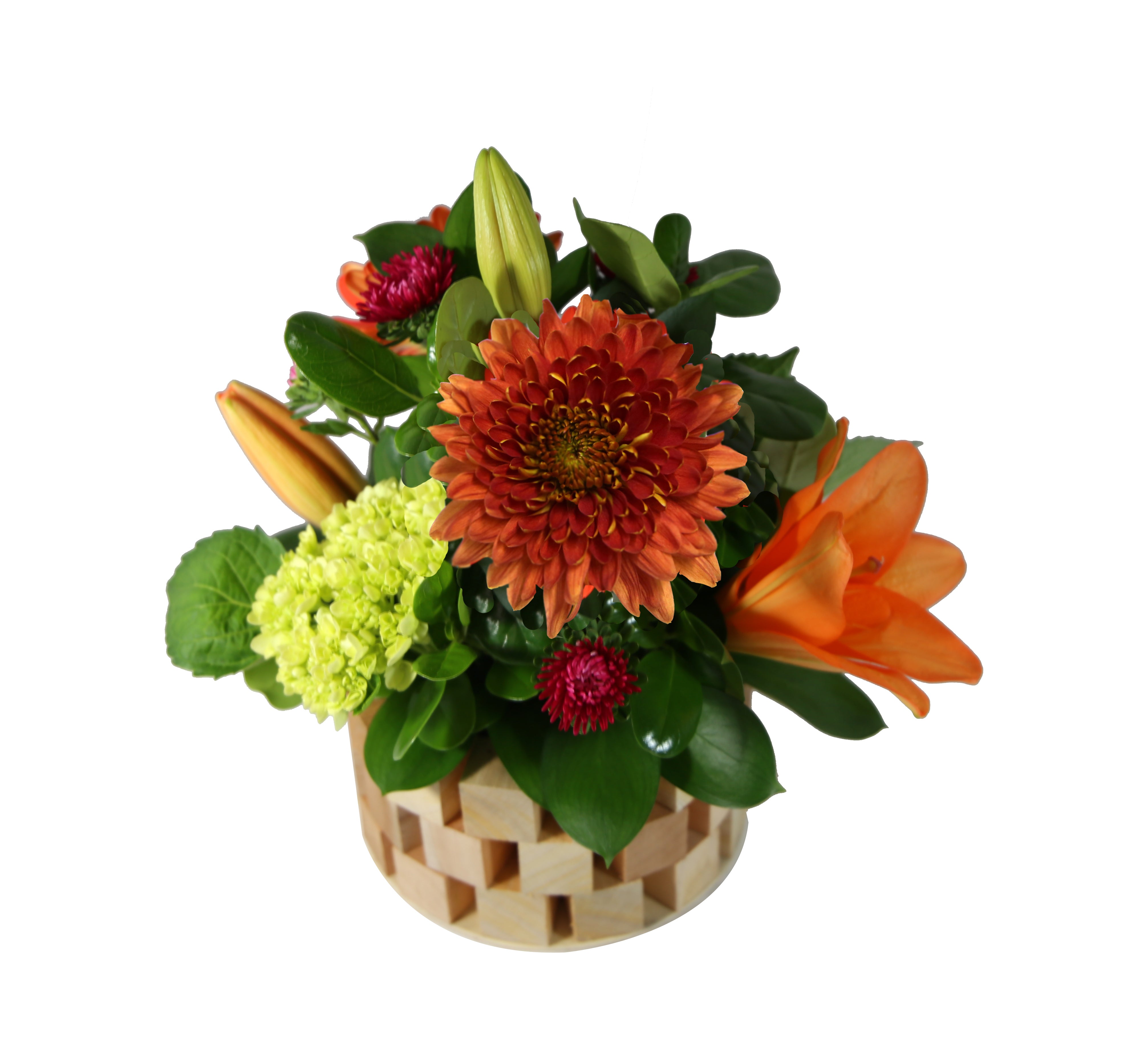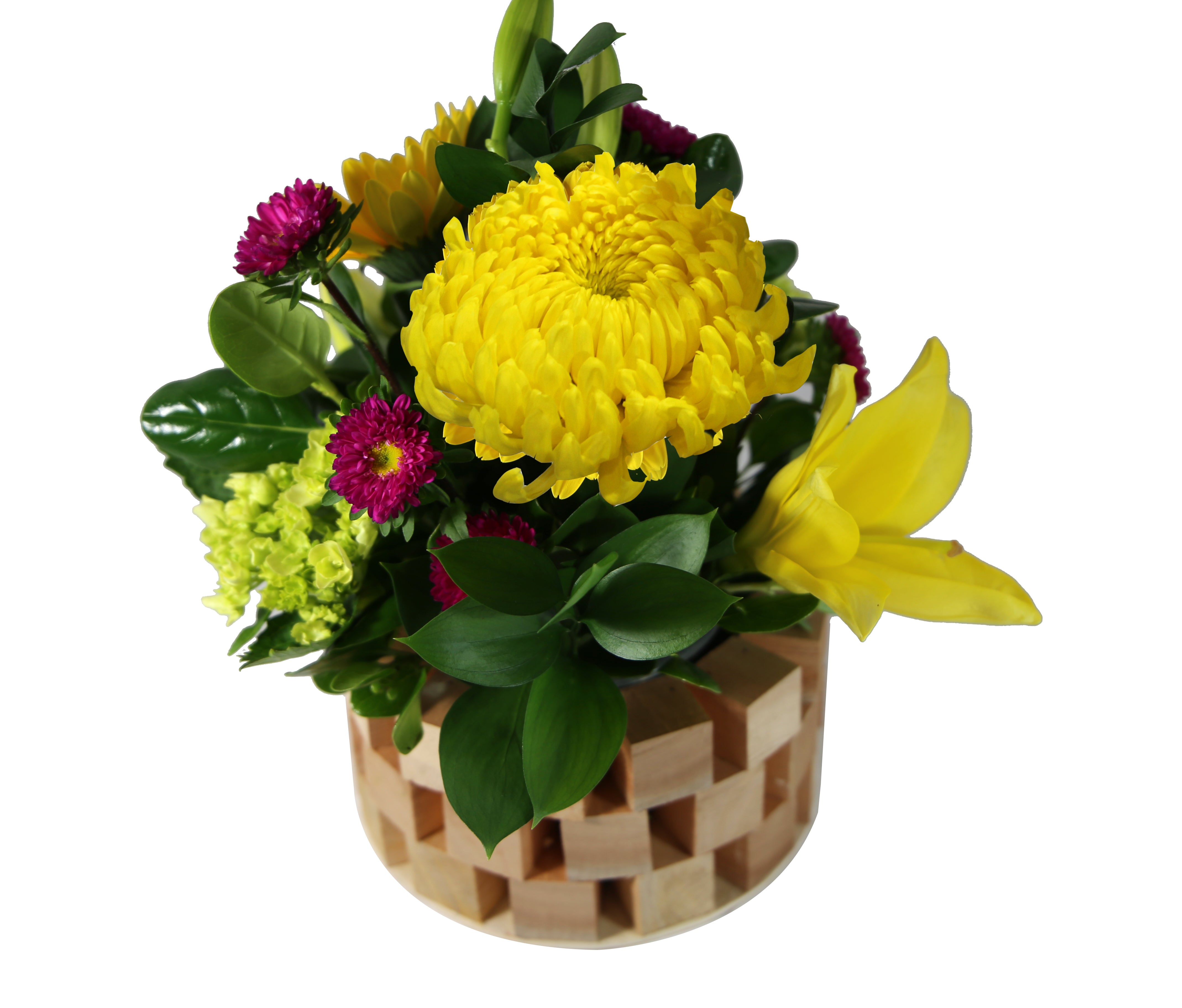 5 Roses, 2 Disbuds, 5 Eryngium, 12 Daisy/Cushion, 12 Buttons Poms, 6 Mini Carnation, 2 Eucalyptus, 10 Ruscus, Wood Container (Natural/White/Brown/Gray Wash paint) with Liner.