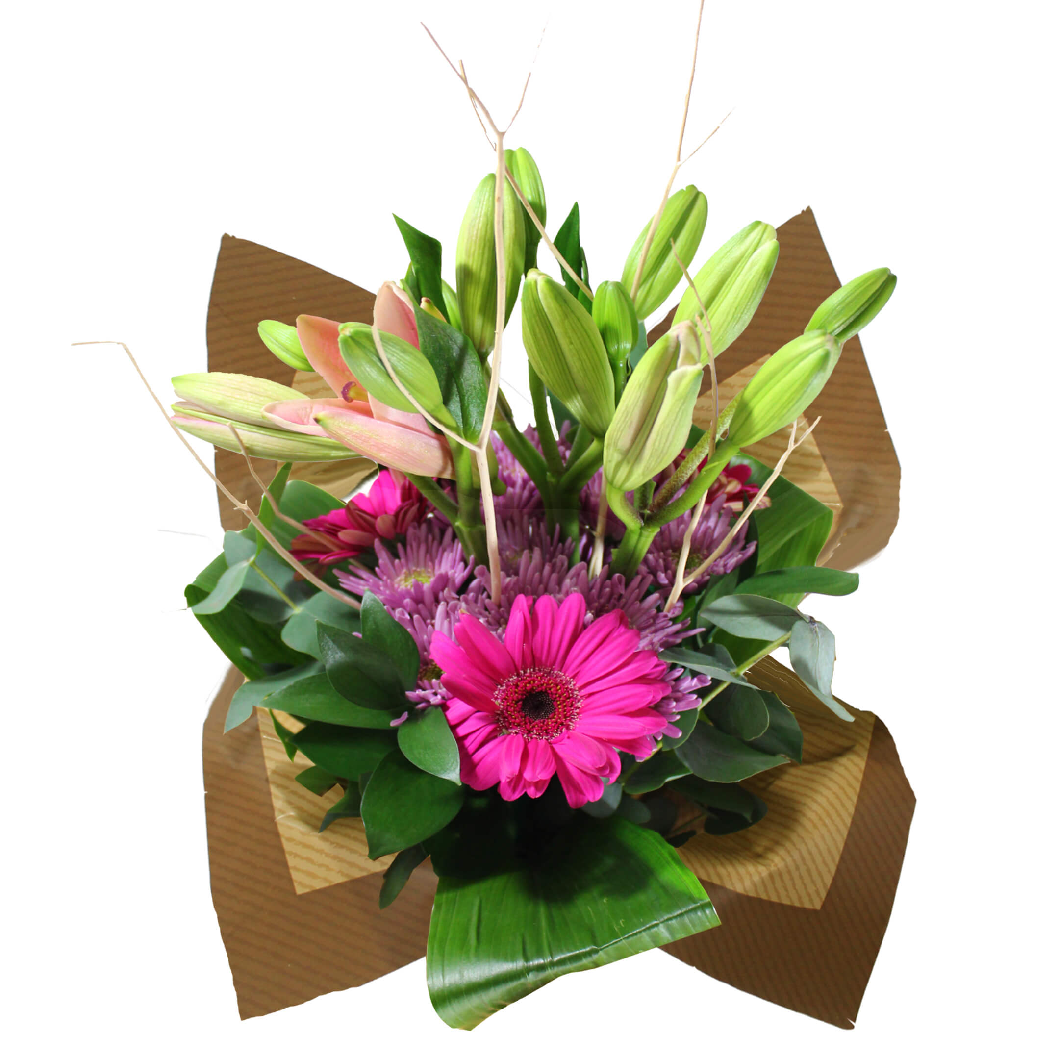 3 Lily, 3 Gerberas/Sunflower/Roses/Pincushion(Protea)/Mini Hydrangeas, 4 Novelty/Button/Micropoms, 3 Eucalyptus, 3 Ruscus, 3 Aspidistra, 2 Branches, Clear sleeve+Wrap+food+rope - spiral construction
