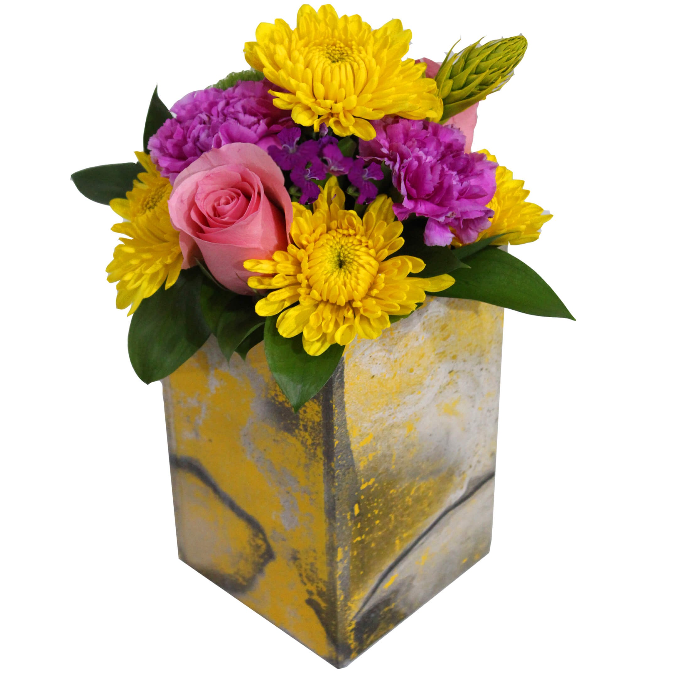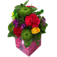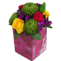 5 Petite Disbuds/Sunflowers/Spiders, 2 Roses, 2 Star of Bethlehem (Natural or Painted), 2 Green Ball/Dianthus/Statice, 3 Open Carnation, 12 Ruscus, Artisan Collection Container with liner.