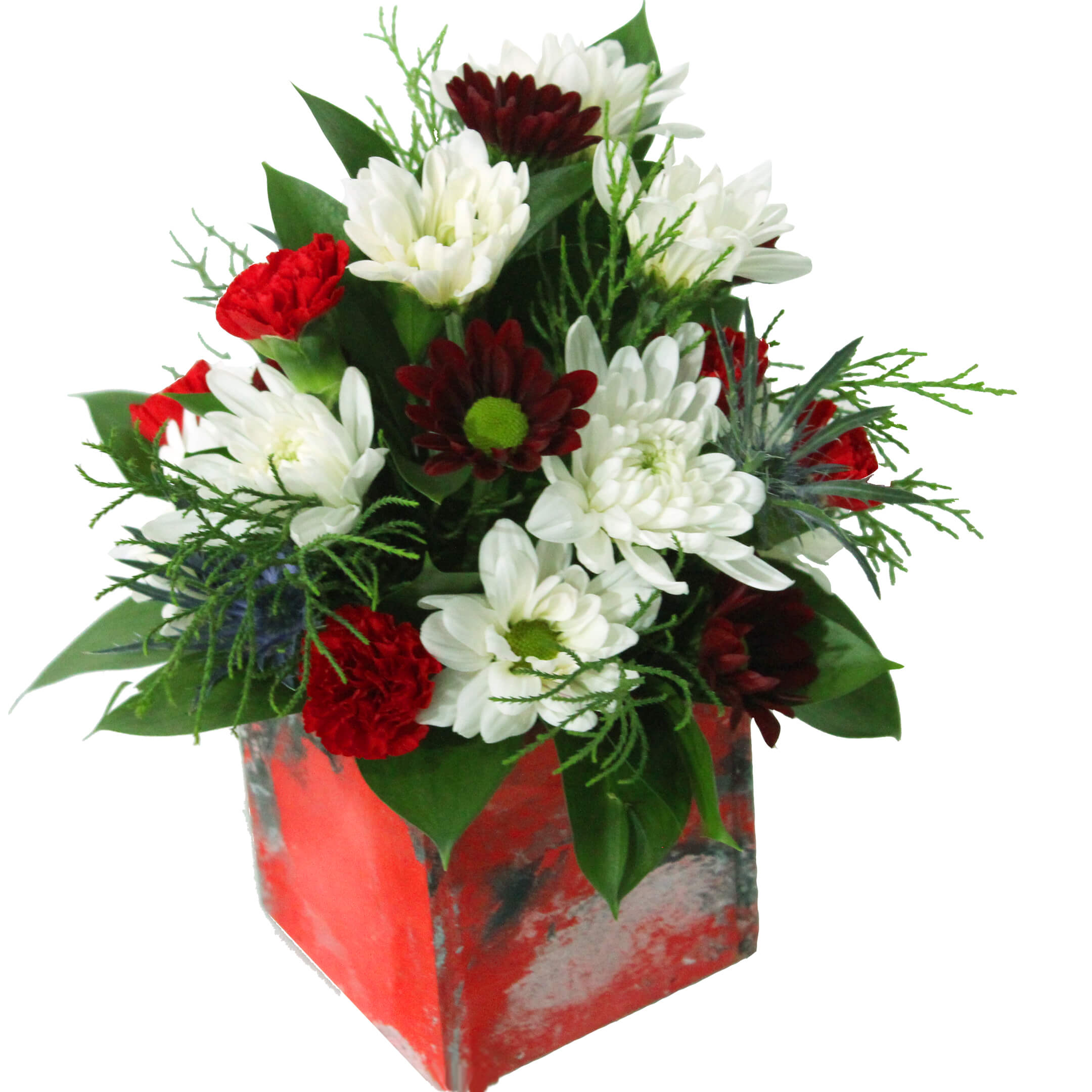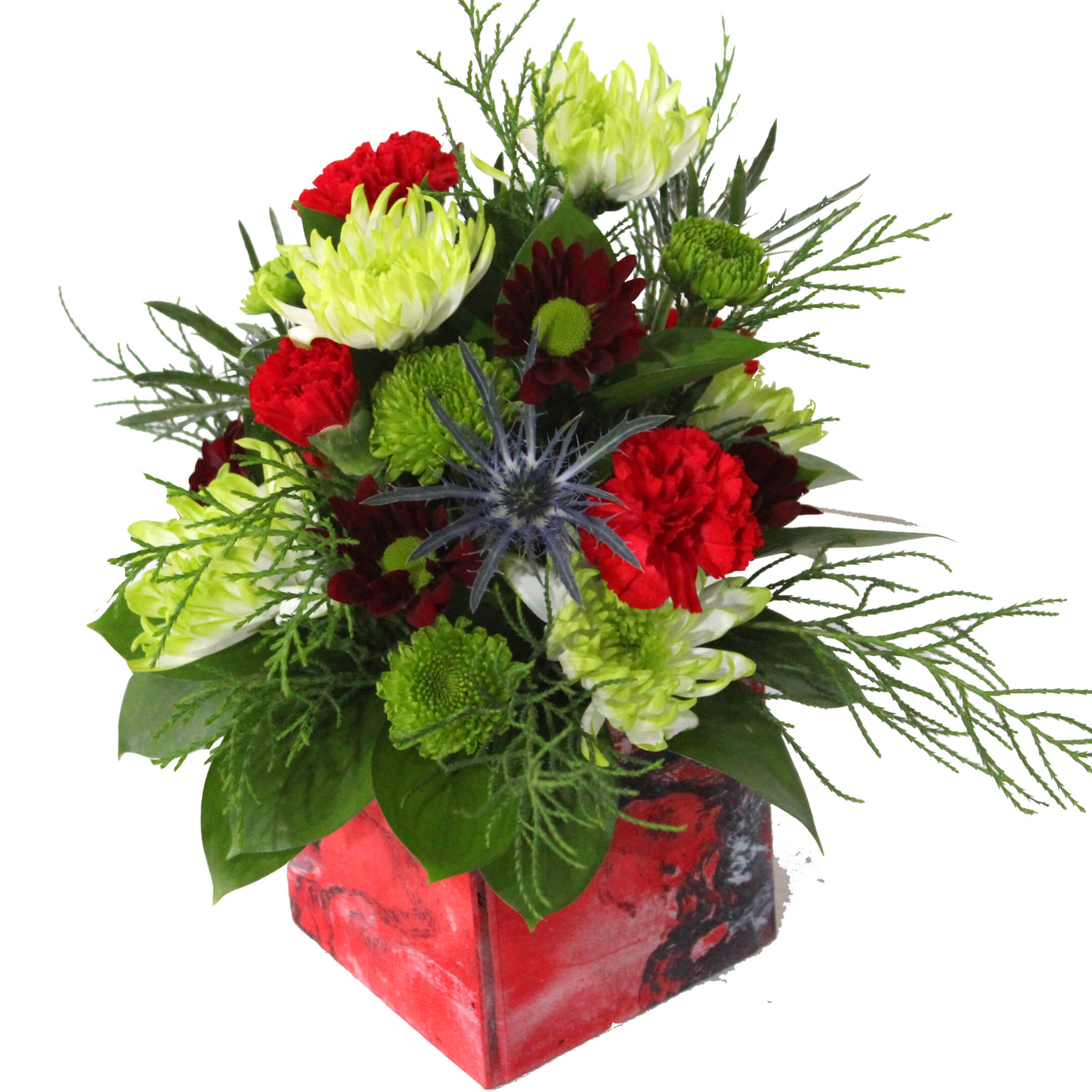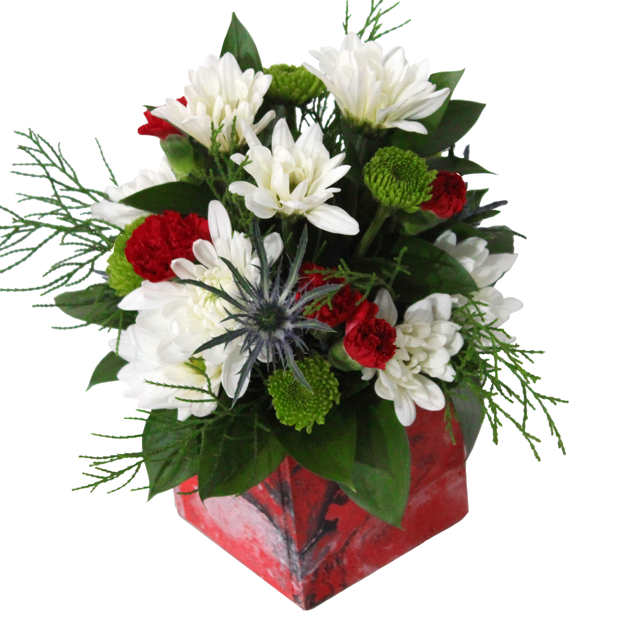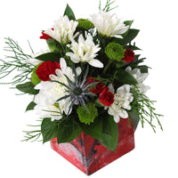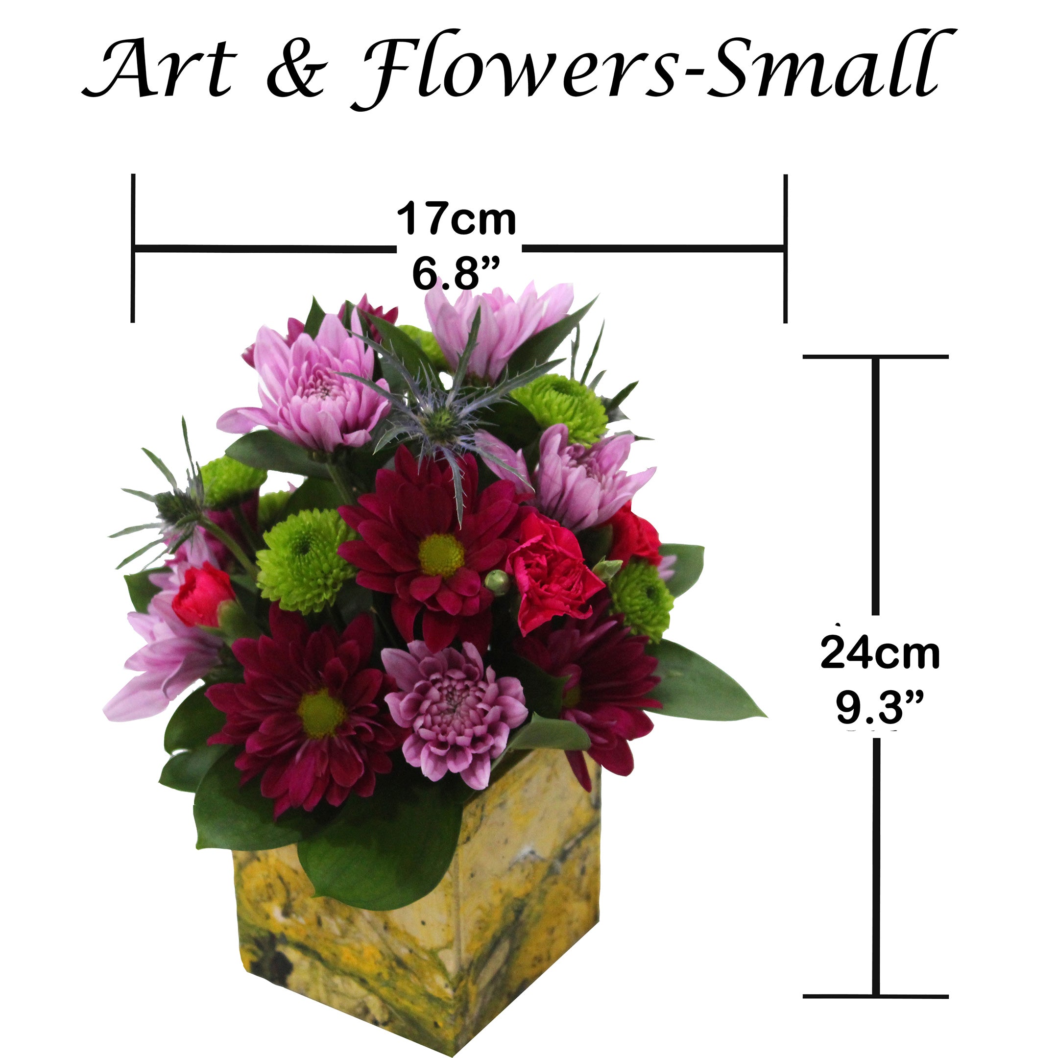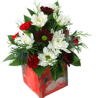 6 Cushion, 5 Daisy, 5 Button poms. 3 Mini Green Ball/Statice/Eryngium, 4 Mini Carnation, 8 Ruscus, Wood Collectible Art Container.