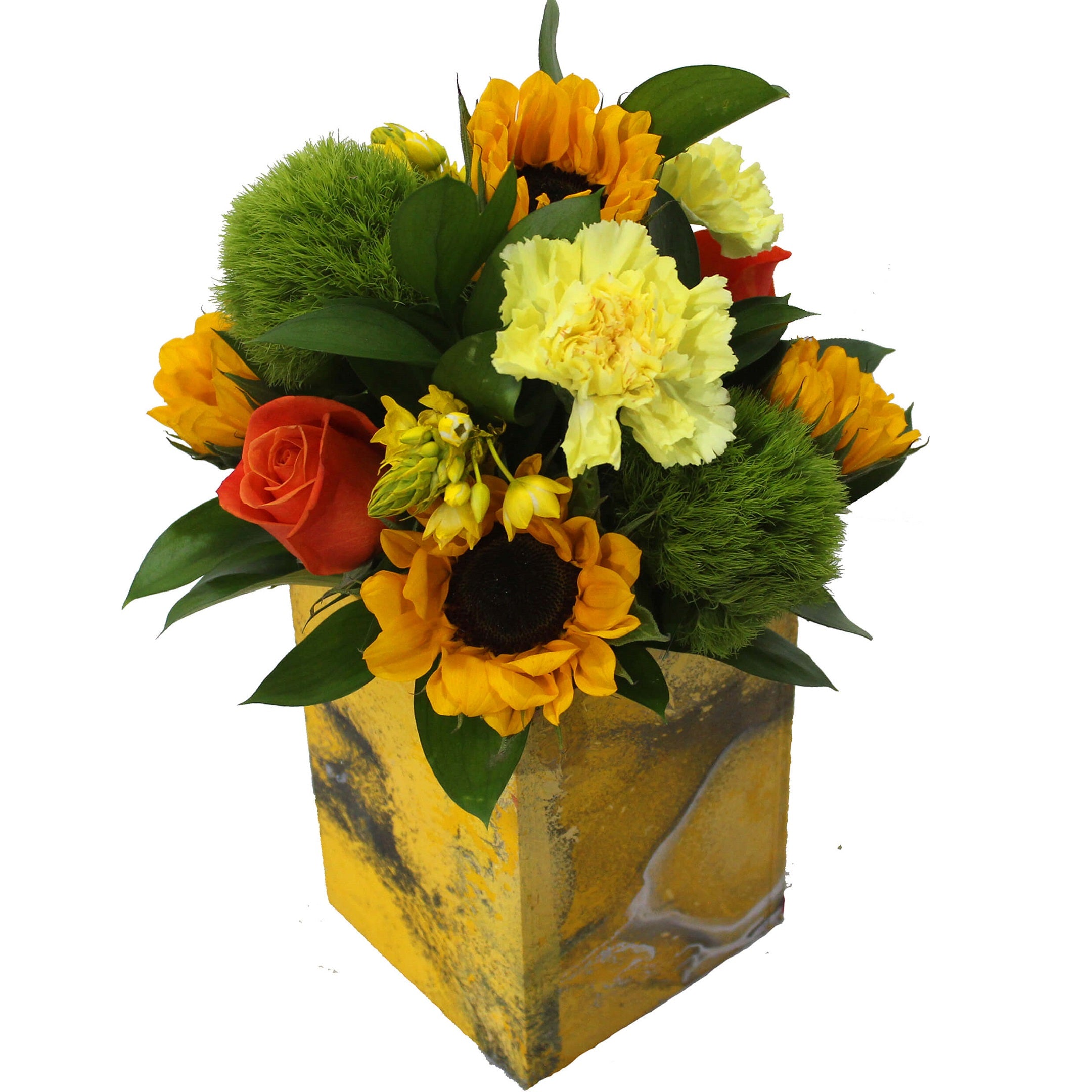 5 Petite Disbuds/Sunflowers/Spiders, 2 Roses, 2 Star of Bethlehem (Natural or Painted), 2 Green Ball/Dianthus/Statice, 3 Open Carnation, 12 Ruscus, Artisan Collection Container with liner.