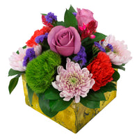 3 Petite Disbuds/Sunflowers, 2 Roses, 3 Stars of Bethlehem (Natural or Painted), 2 Mini Green Ball/Statice(5 placements), 3 Carnation (Open Cut), 12 Ruscus, 4 Dianthus/Matsumoto/Eryngium, Collectible Wood Artisan Container in a seasonal color, liner.