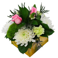 3 Petite Disbuds/Sunflowers, 2 Roses, 3 Stars of Bethlehem (Natural or Painted), 2 Mini Green Ball/Statice(5 placements), 3 Carnation (Open Cut), 12 Ruscus, 4 Dianthus/Matsumoto/Eryngium, Collectible Wood Artisan Container in a seasonal color, liner.