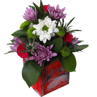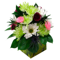 6 Cushion, 5 Daisy, 5 Button poms. 3 Mini Green Ball/Statice/Eryngium, 4 Mini Carnation, 8 Ruscus, Wood Collectible Art Container.