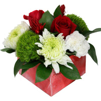 3 Petite Disbuds/Sunflowers, 2 Roses, 3 Stars of Bethlehem (Natural or Painted), 2 Mini Green Ball/Statice(5 placements), 3 Carnation (Open Cut), 12 Ruscus, 4 Dianthus/Matsumoto/Eryngium, Collectible Wood Artisan Container in a seasonal color, liner.