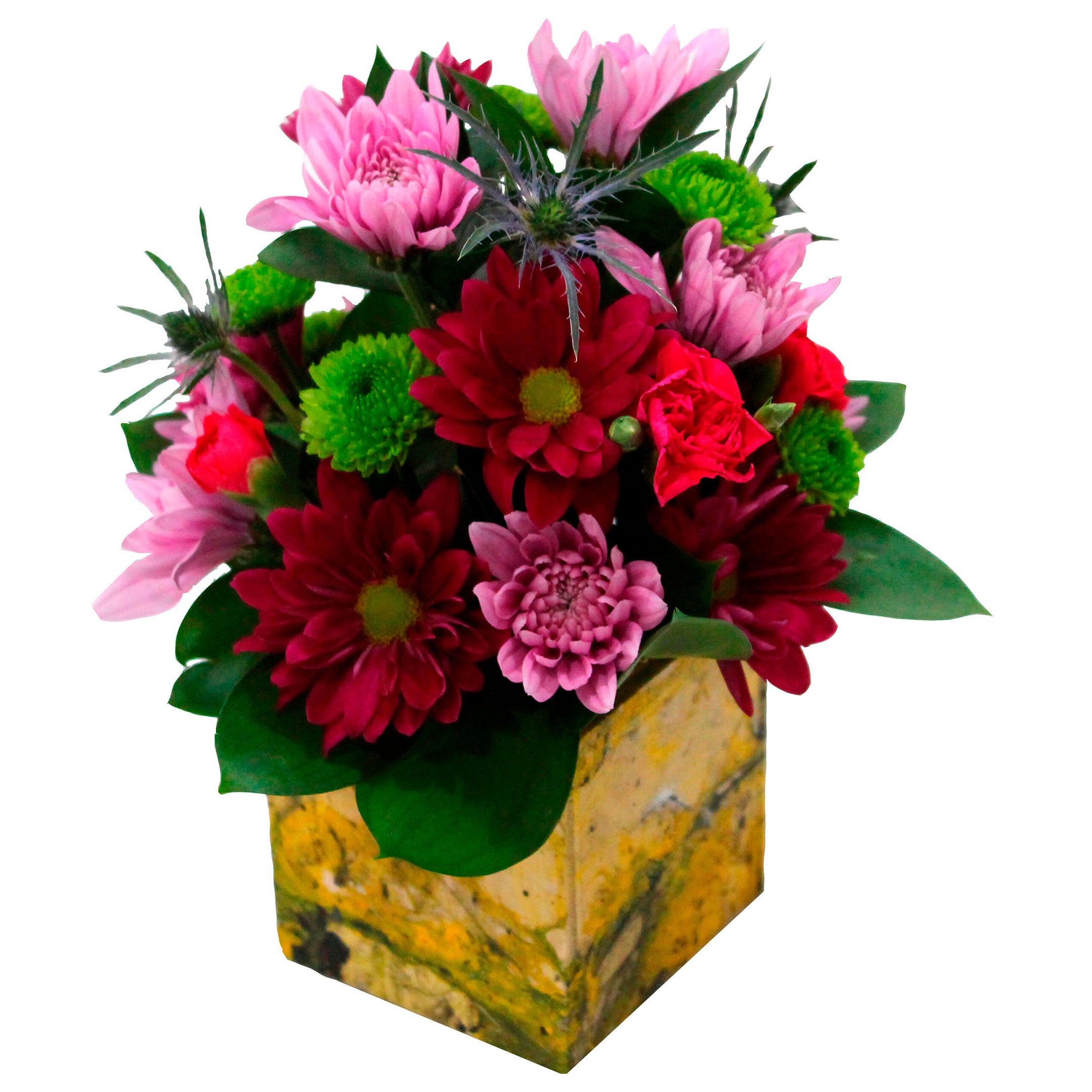 6 Cushion, 5 Daisy, 5 Button poms. 3 Mini Green Ball/Statice/Eryngium, 4 Mini Carnation, 8 Ruscus, Wood Collectible Art Container.