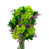 Beautiful mix of: 15 Roses/Disbuds/Mini Hydrangea Mojito/Mini Hydrangea Shocking Blue/Big Green Ball/Color Calla, 16 Ruscus, 4 Limonium/Caspia (Natural), Clear sleeve+UPC+Flower food+ Rope