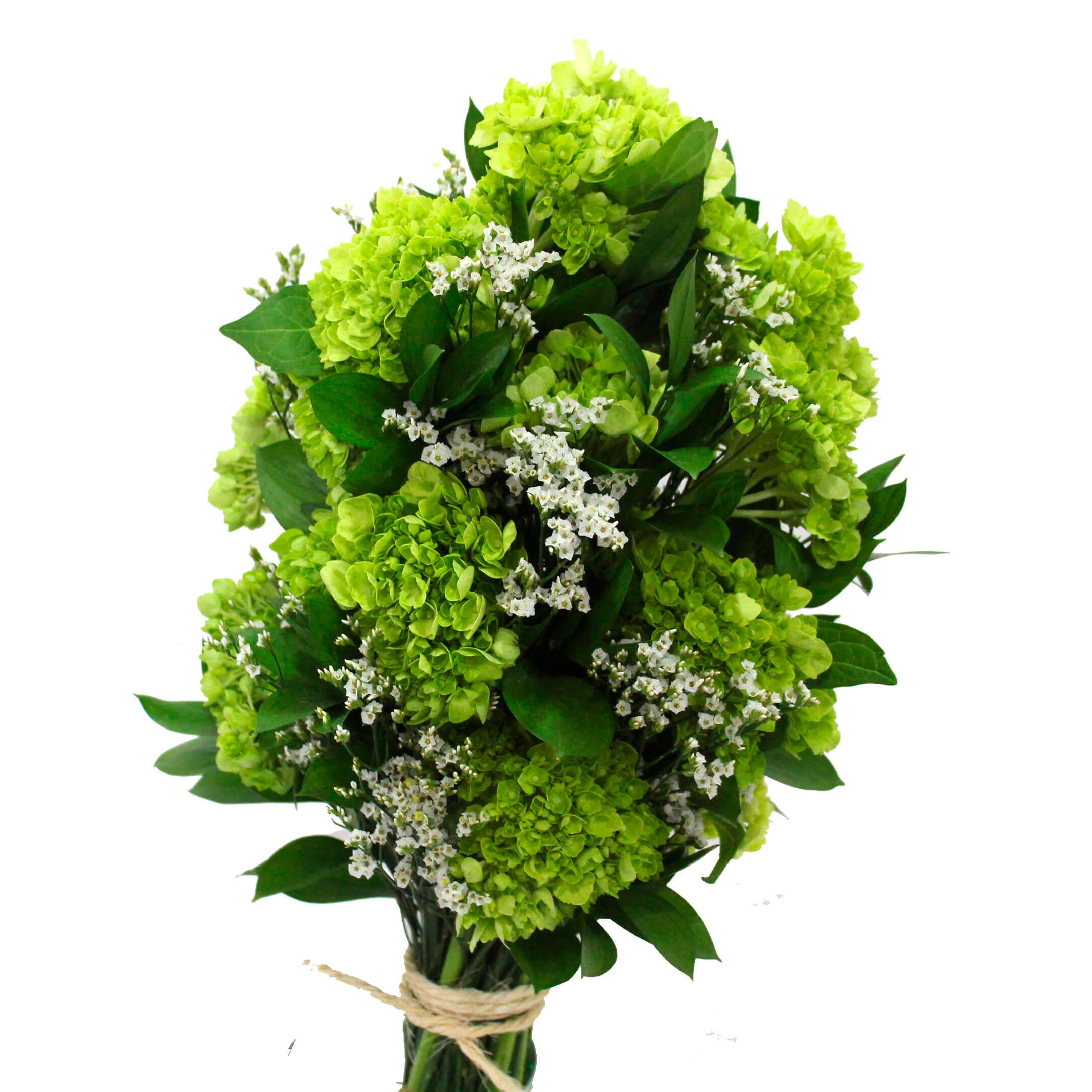 Beautiful mix of: 15 Roses/Disbuds/Mini Hydrangea Mojito/Mini Hydrangea Shocking Blue/Big Green Ball/Color Calla, 16 Ruscus, 4 Limonium/Caspia (Natural), Clear sleeve+UPC+Flower food+ Rope