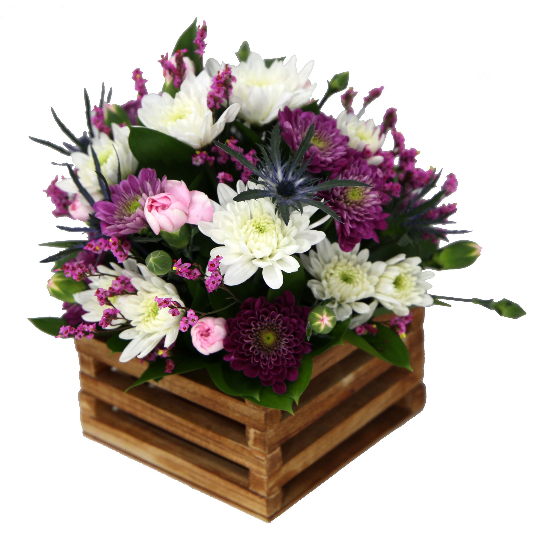 9 Laterals Cushions, 6 Laterals Buttons/Novelty Poms, 5 Laterals Matsumotos/Eryngium (Natural or Painted)/Small Green Ball, 7 Laterals Mini Carnations, 12 Laterals Limonium/Caspia, 14 Laterals Ruscus & Large Vintage Wooden Box + Liner.