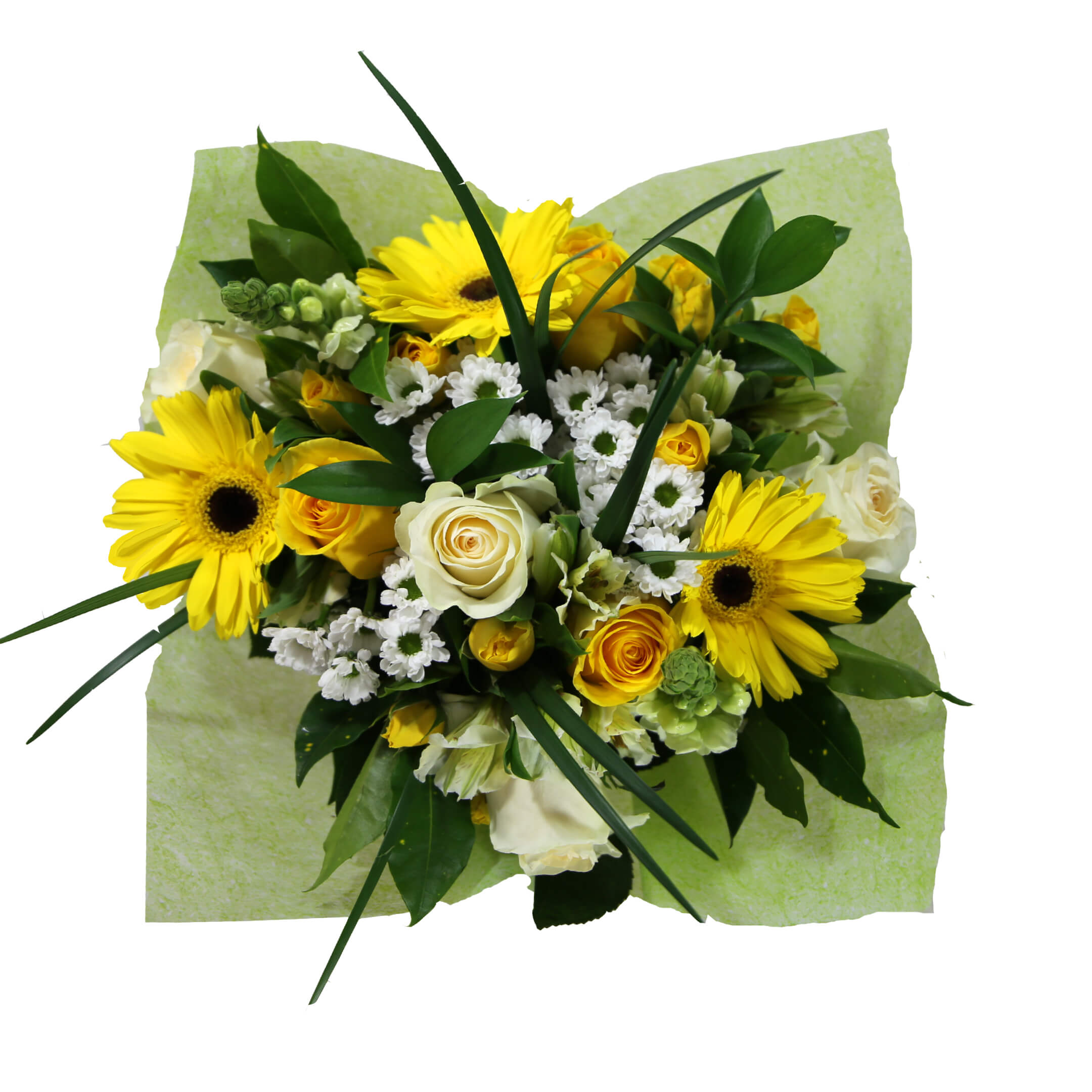 Beautiful mix of: 7 Roses, 3 Spray Roses, 4 Micropoms/Novelty, 3 Gerberas/Mini Hydrangea Mojito/Disbuds/Hydrangea, 3 Premium Green, 2 Ruscus, 4 Liligrass (3 tips), 2 Dianthus/Green Ball/Phlox/Stock/Snap/Eryngium/Hypericum, 3 Alstroemeria, Clear sleeve+Wrap+UPC+Flower Food