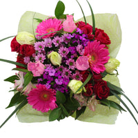Beautiful mix of: 7 Roses, 3 Spray Roses, 4 Micropoms/Novelty, 3 Gerberas/Mini Hydrangea Mojito/Disbuds/Hydrangea, 3 Premium Green, 2 Ruscus, 4 Liligrass (3 tips), 2 Dianthus/Green Ball/Phlox/Stock/Snap/Eryngium/Hypericum, 3 Alstroemeria, Clear sleeve+Wrap+UPC+Flower Food