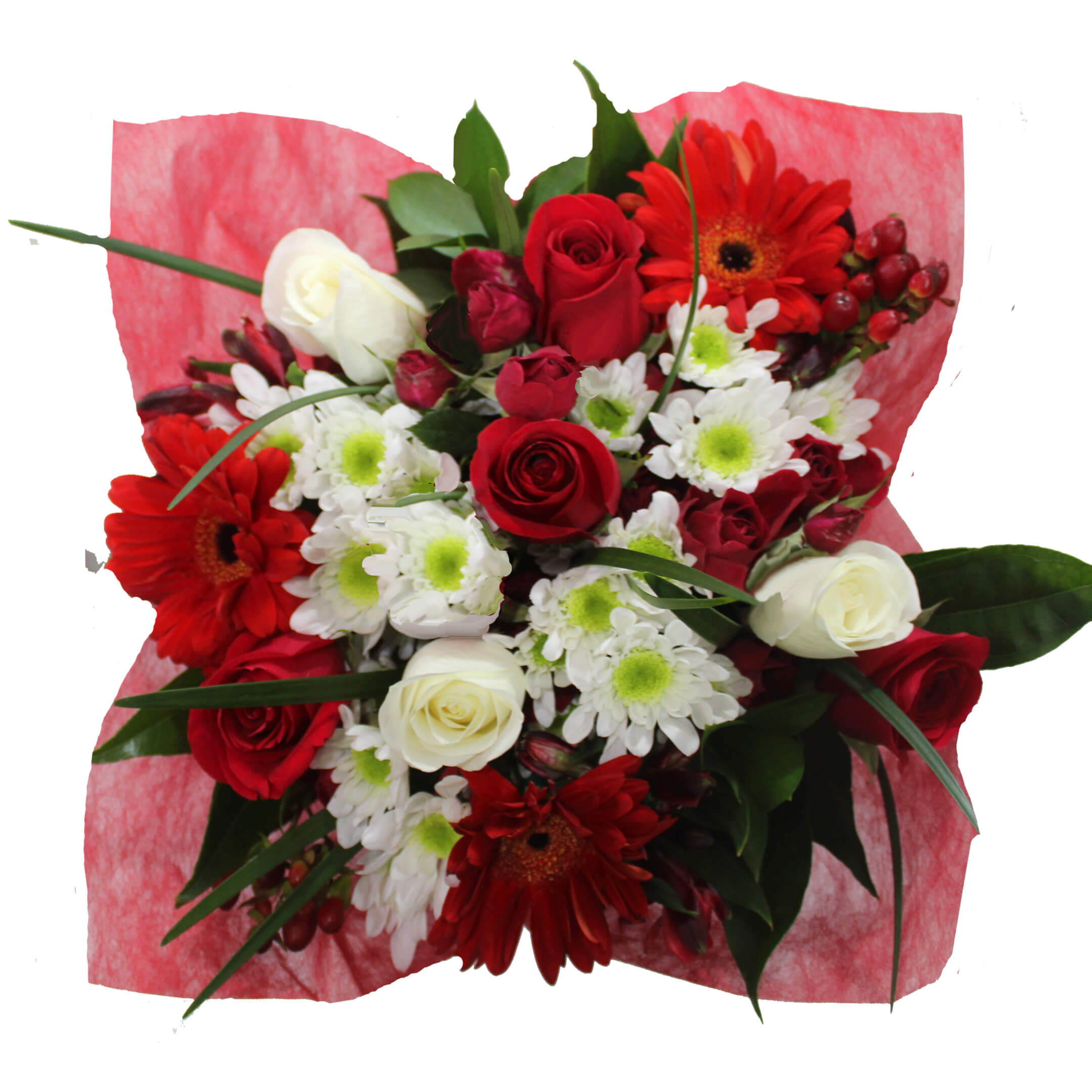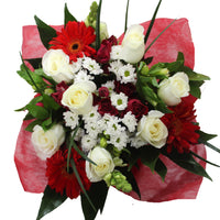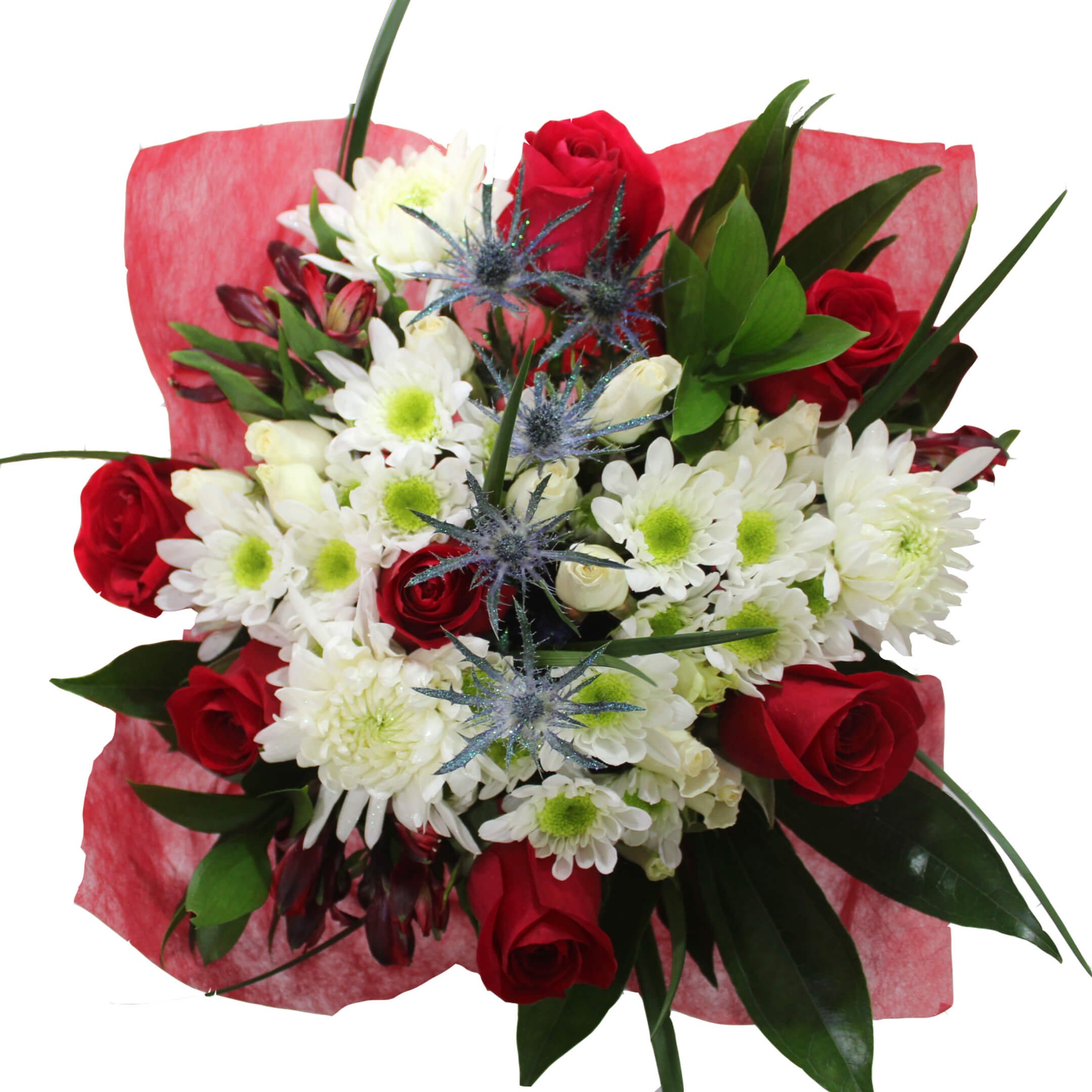 Beautiful mix of: 7 Roses, 3 Spray Roses, 4 Micropoms/Novelty, 3 Gerberas/Mini Hydrangea Mojito/Disbuds/Hydrangea, 3 Premium Green, 2 Ruscus, 4 Liligrass (3 tips), 2 Dianthus/Green Ball/Phlox/Stock/Snap/Eryngium/Hypericum, 3 Alstroemeria, Clear sleeve+Wrap+UPC+Flower Food