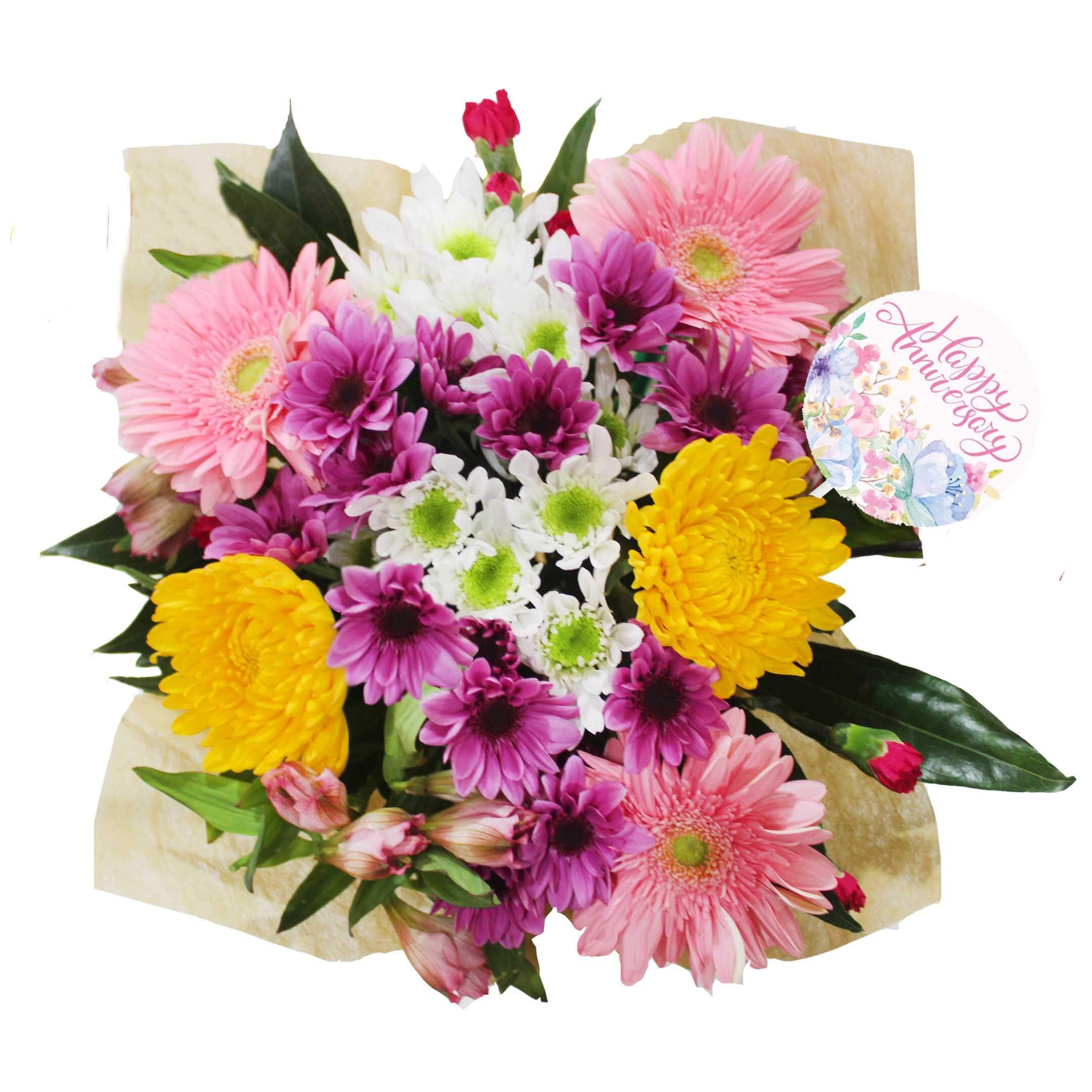 Beautiful mix of: 3 Sunflower/Gerbera, 2 Disbuds, 1 Seasonal Pick, 3 Novelty Poms, 2 Micropoms/Button, 1 Matsumoto Aster/Alstroemeria, 2 Matsumoto/Alstromeria/Statice, 3 Carnation/Mini Carnation, 3 Cocculus, Clear sleeve + Wrap + Flower Food