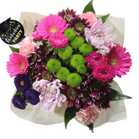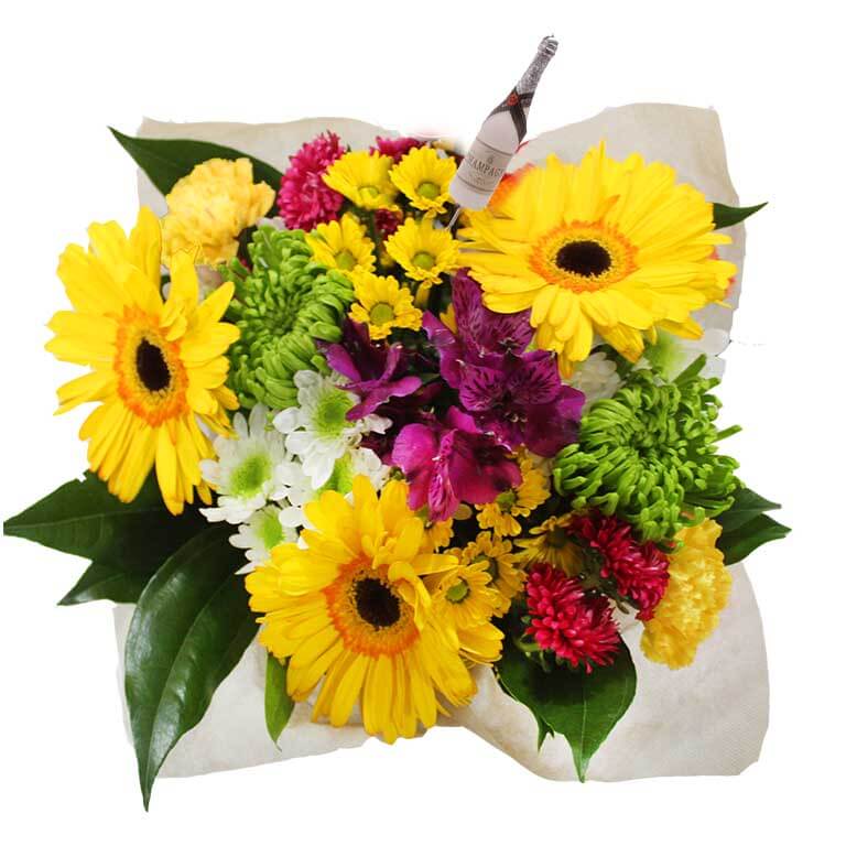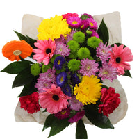 Beautiful mix of: 3 Sunflower/Gerbera, 2 Disbuds, 1 Seasonal Pick, 3 Novelty Poms, 2 Micropoms/Button, 1 Matsumoto Aster/Alstroemeria, 2 Matsumoto/Alstromeria/Statice, 3 Carnation/Mini Carnation, 3 Cocculus, Clear sleeve + Wrap + Flower Food