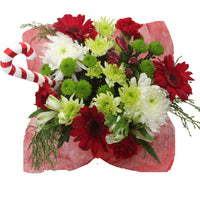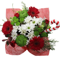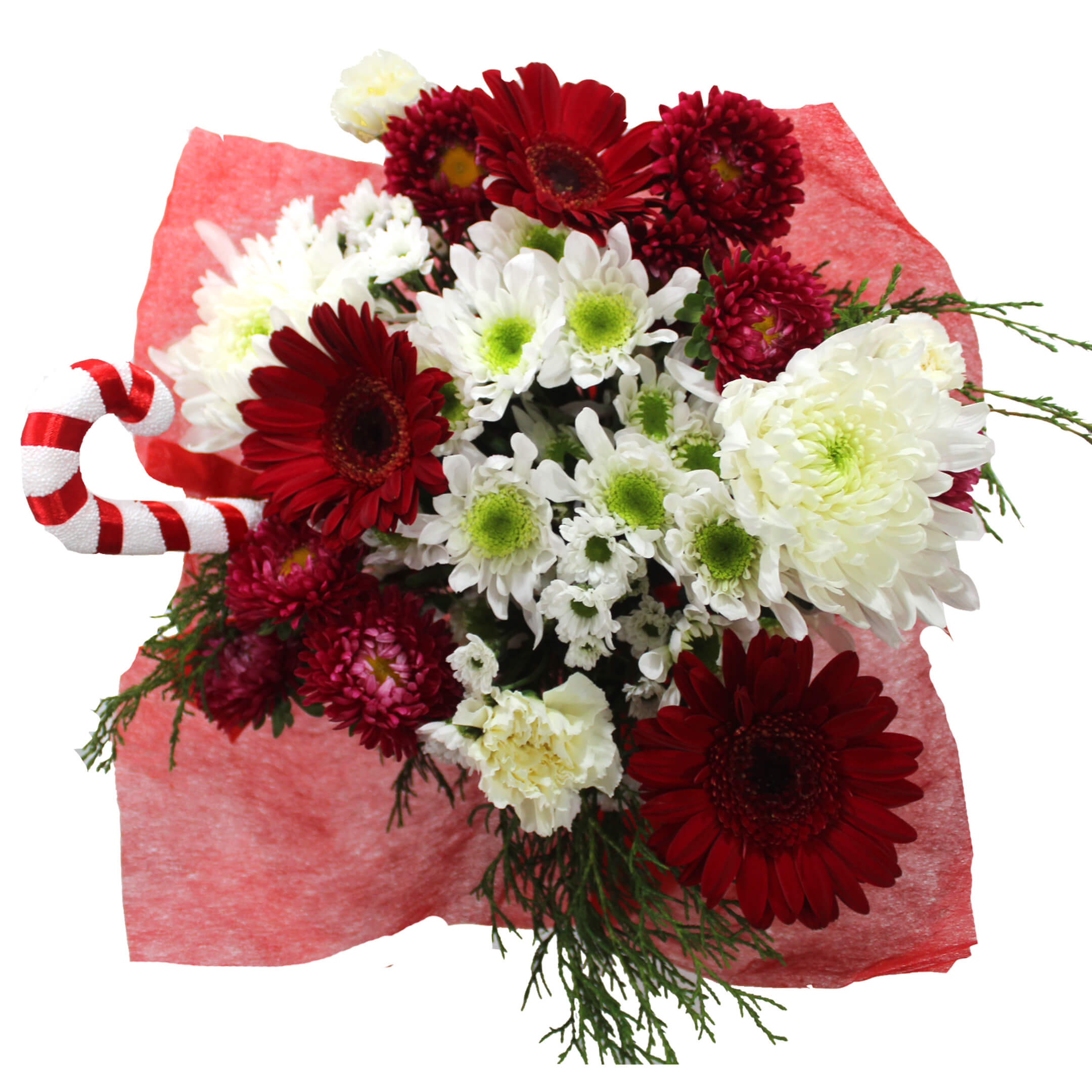 Beautiful mix of: 3 Sunflower/Gerbera, 2 Disbuds, 1 Seasonal Pick, 3 Novelty Poms, 2 Micropoms/Button, 1 Matsumoto Aster/Alstroemeria, 2 Matsumoto/Alstromeria/Statice, 3 Carnation/Mini Carnation, 3 Cocculus, Clear sleeve + Wrap + Flower Food
