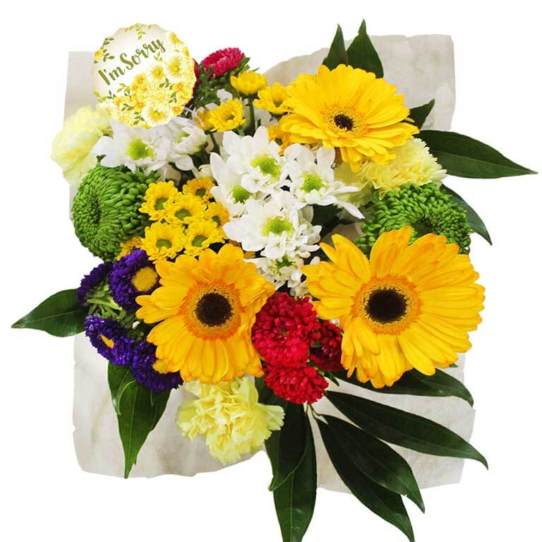 Beautiful mix of: 3 Sunflower/Gerbera, 2 Disbuds, 1 Seasonal Pick, 3 Novelty Poms, 2 Micropoms/Button, 1 Matsumoto Aster/Alstroemeria, 2 Matsumoto/Alstromeria/Statice, 3 Carnation/Mini Carnation, 3 Cocculus, Clear sleeve + Wrap + Flower Food