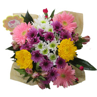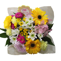 Beautiful mix of: 3 Sunflower/Gerbera, 2 Disbuds, 1 Seasonal Pick, 3 Novelty Poms, 2 Micropoms/Button, 1 Matsumoto Aster/Alstroemeria, 2 Matsumoto/Alstromeria/Statice, 3 Carnation/Mini Carnation, 3 Cocculus, Clear sleeve + Wrap + Flower Food