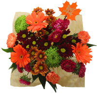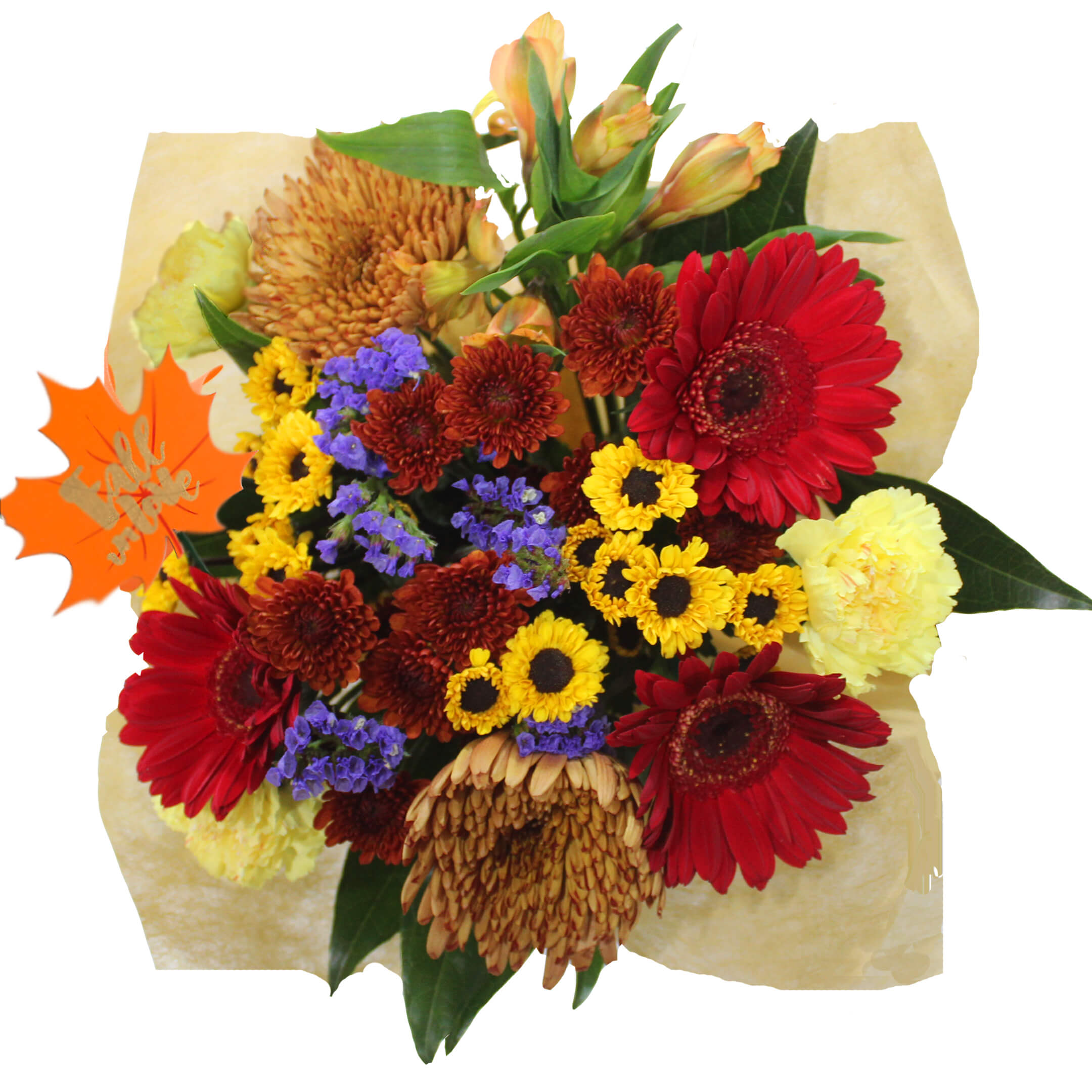 3 Sunflwoer/Gerbera, 2 Disbuds, 1 Seasonal Pick, 3 Novelty Poms, 2 Micropoms/Button, 1 Matsumoto Aster/Alstromeria, 2 Matsumoto/Alstromeria/Statice, 3 Carnation/Minicarnation, 3 Coculus, Clear sleeve + Wrap + Flower Food