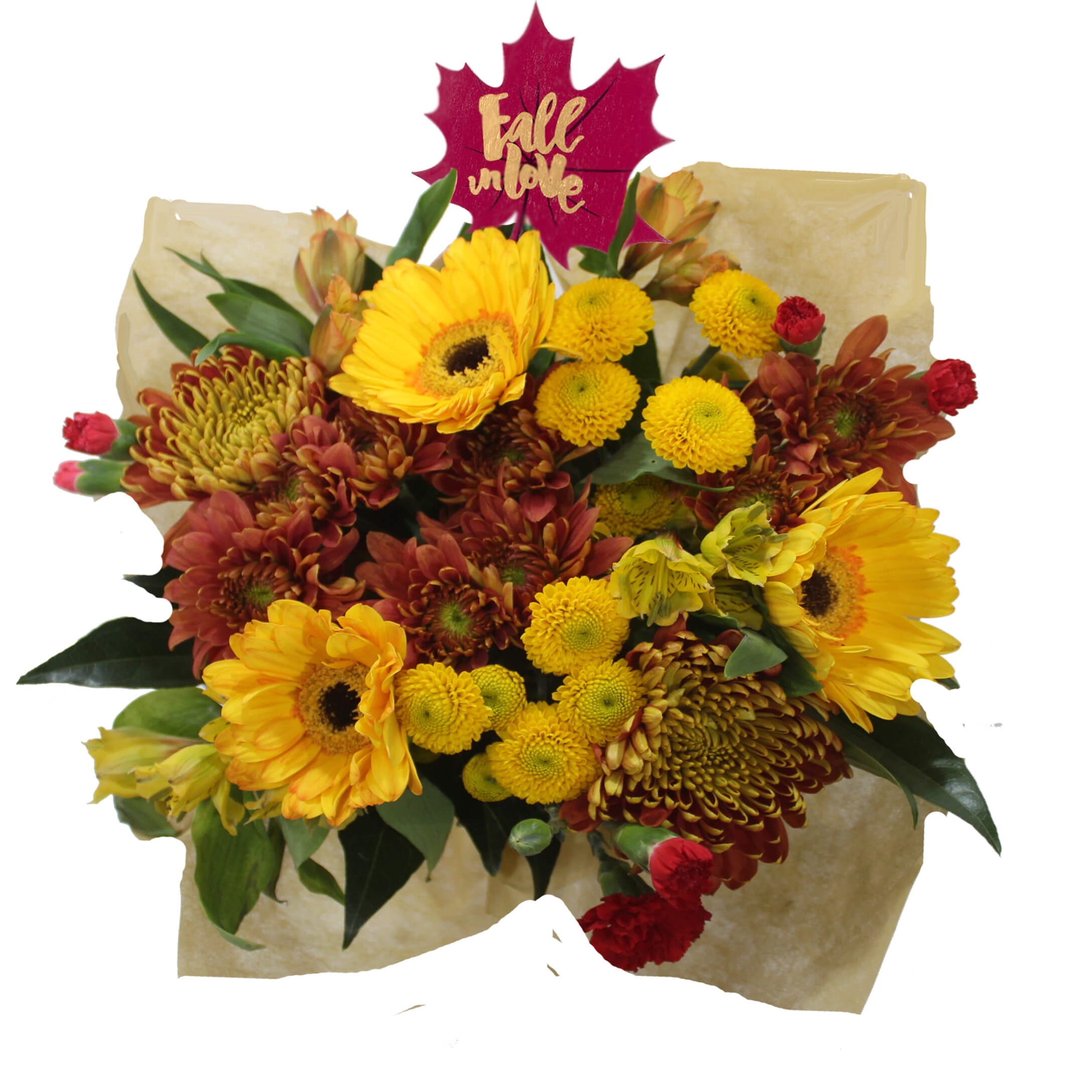 3 Sunflower/Gerbera, 2 Disbuds, 1 Seasonal Pick, 3 Novelty Poms, 2 Micropoms/Button, 1 Matsumoto Aster/Alstroemeria, 2 Matsumoto/Alstromeria/Statice, 3 Carnation/Mini Carnation, 3 Cocculus, Clear sleeve + Wrap + Flower Food