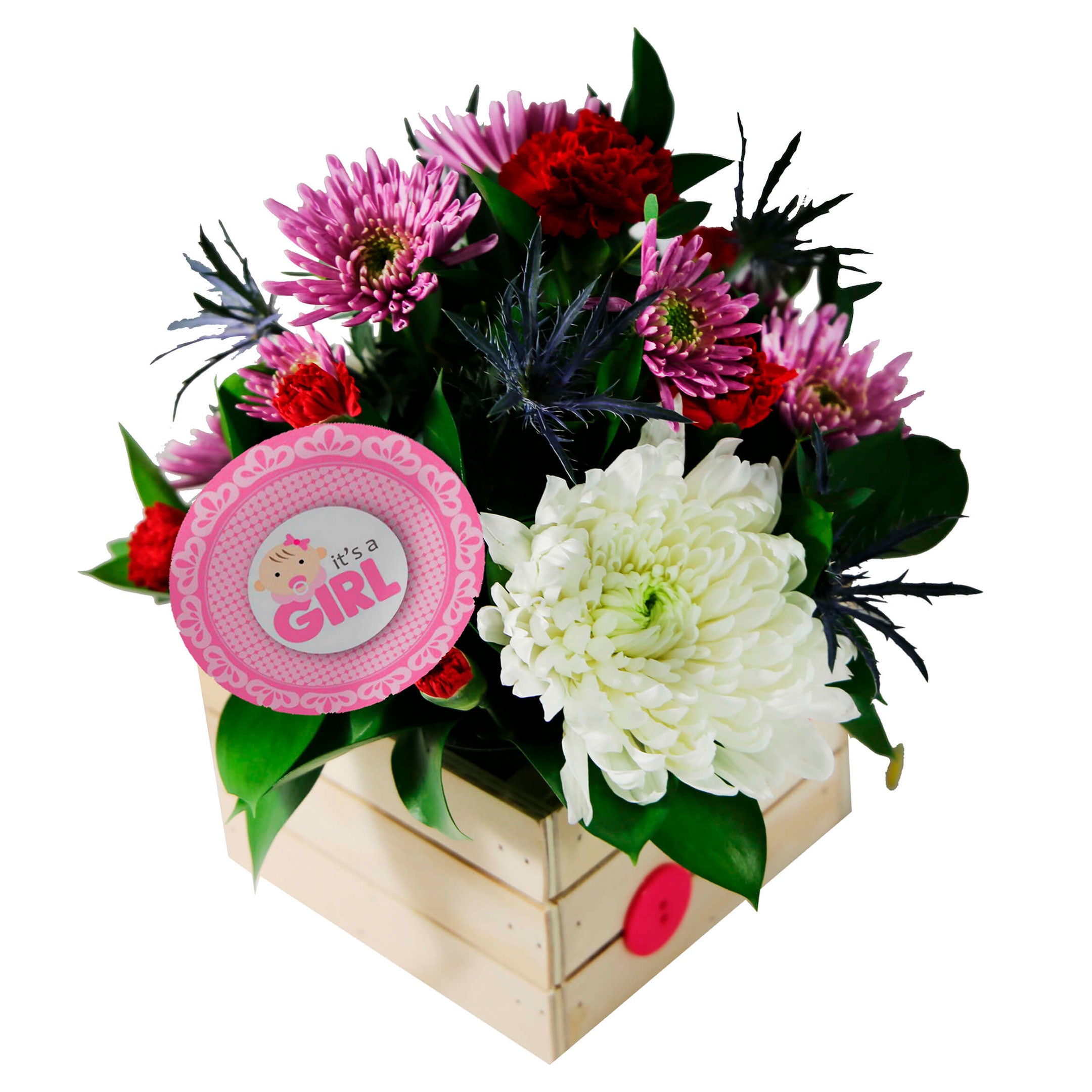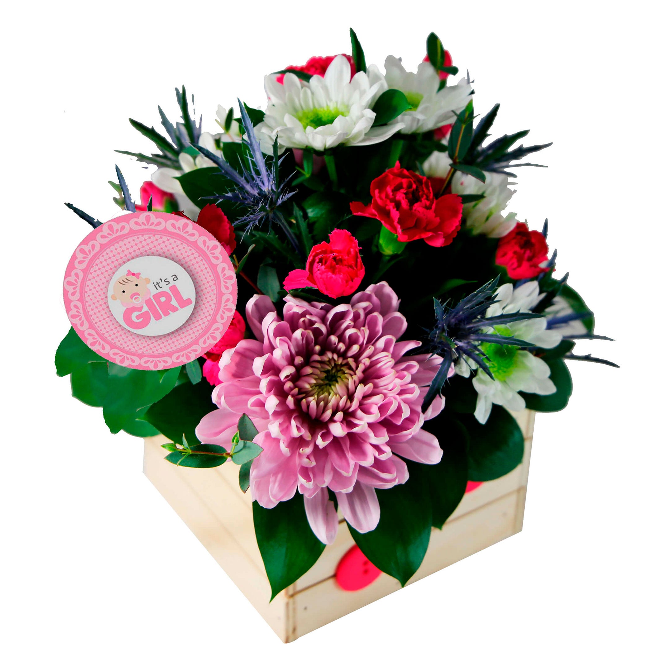 5 Laterals Mini Carnations, 8 Laterals Buttons/Novelty Poms, 2 Disbuds, 6 Laterals Eryngium, 8 Laterals Ruscus, 13 Laterals Parvifolia & 1 Seasonal Pick, Liner.