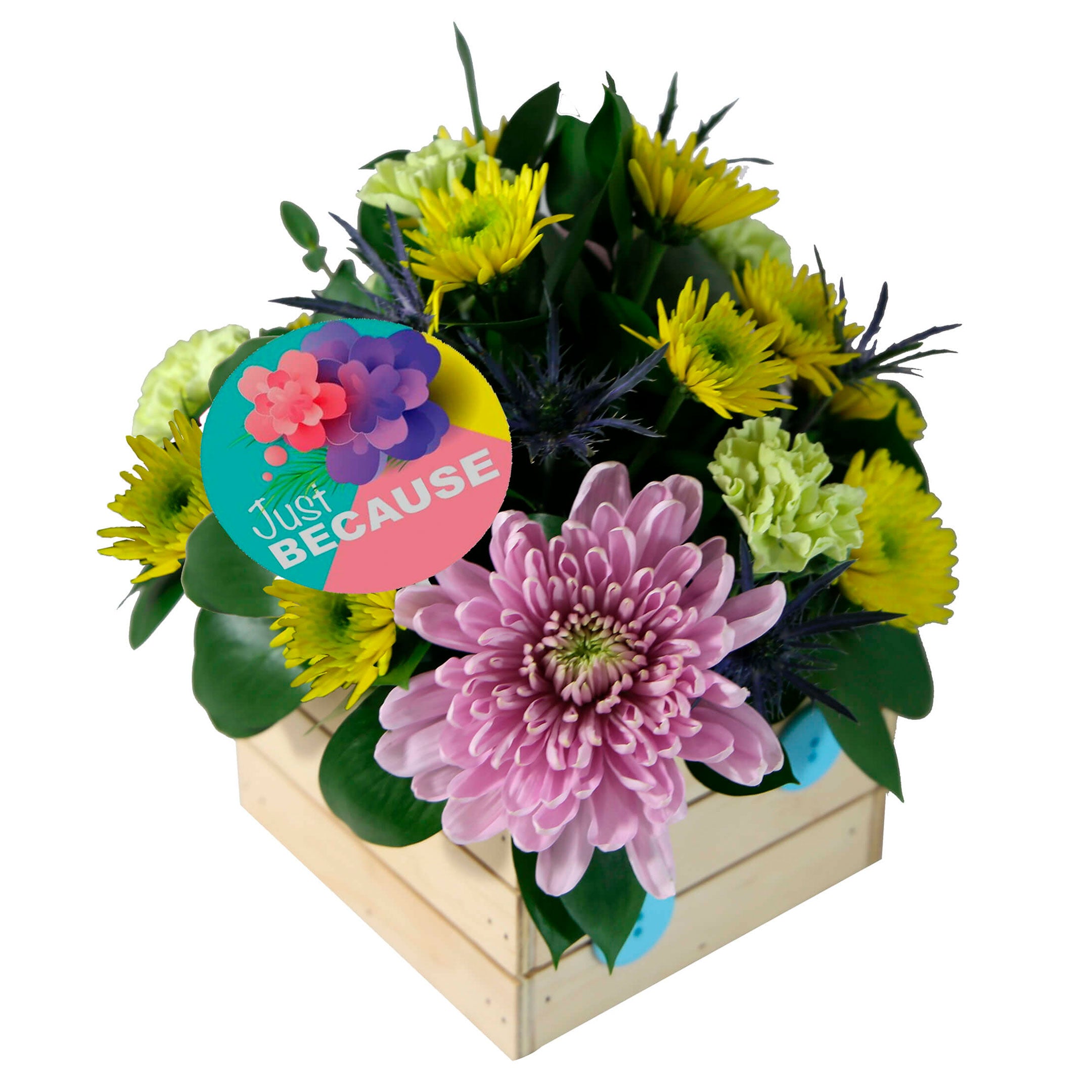 5 Laterals Mini Carnations, 8 Laterals Buttons/Novelty Poms, 2 Disbuds, 6 Laterals Eryngium, 8 Laterals Ruscus, 13 Laterals Parvifolia & 1 Seasonal Pick, Liner.