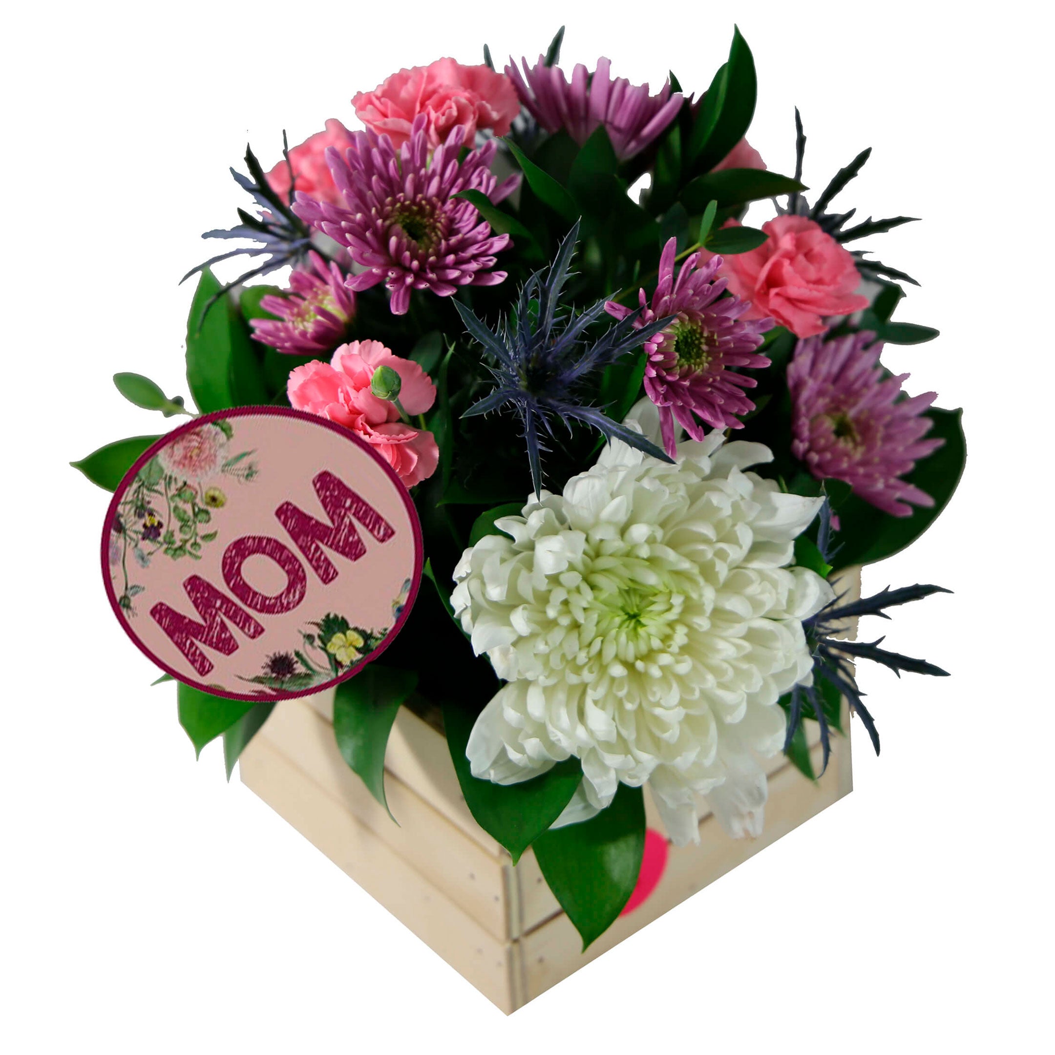 5 Laterals Mini Carnations, 8 Laterals Buttons/Novelty Poms, 2 Disbuds, 6 Laterals Eryngium, 8 Laterals Ruscus, 13 Laterals Parvifolia & 1 Seasonal Pick, Liner.
