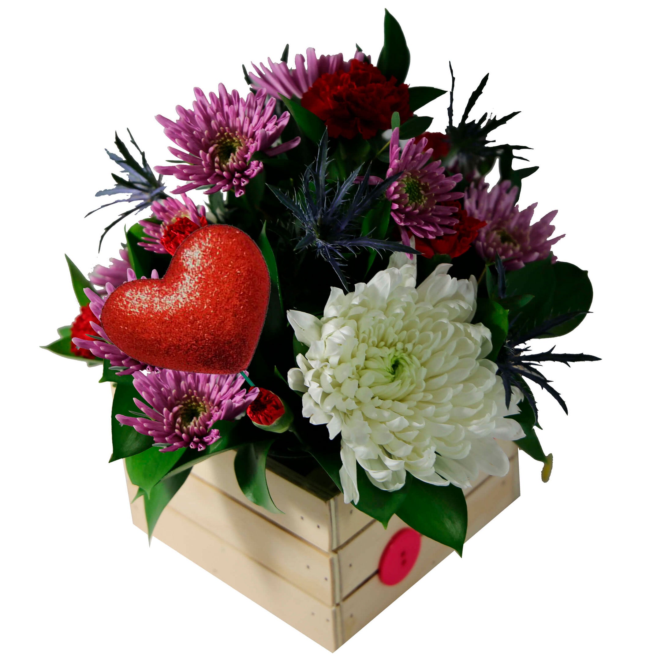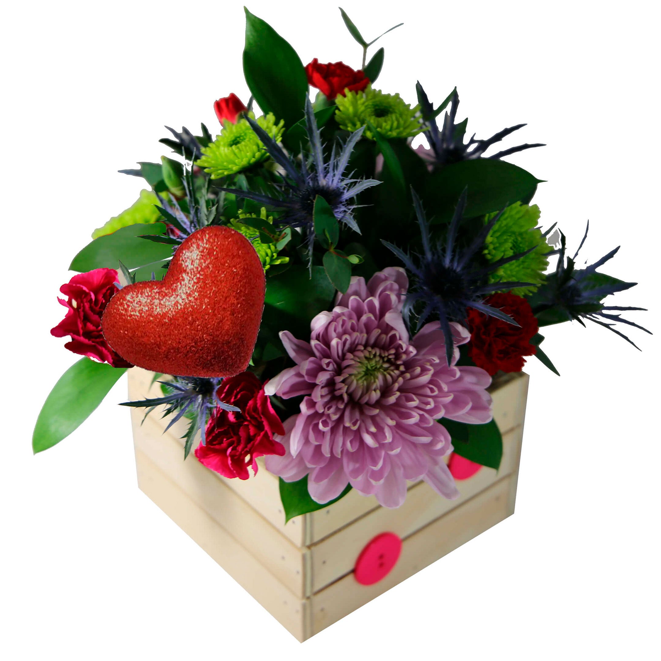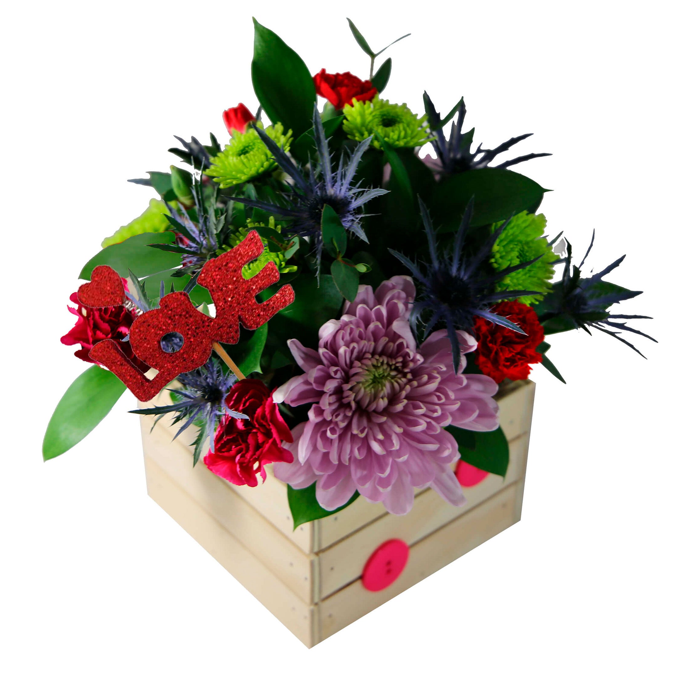 5 Laterals Mini Carnations, 8 Laterals Buttons/Novelty Poms, 2 Disbuds, 6 Laterals Eryngium, 8 Laterals Ruscus, 13 Laterals Parvifolia & 1 Seasonal Pick, Liner.