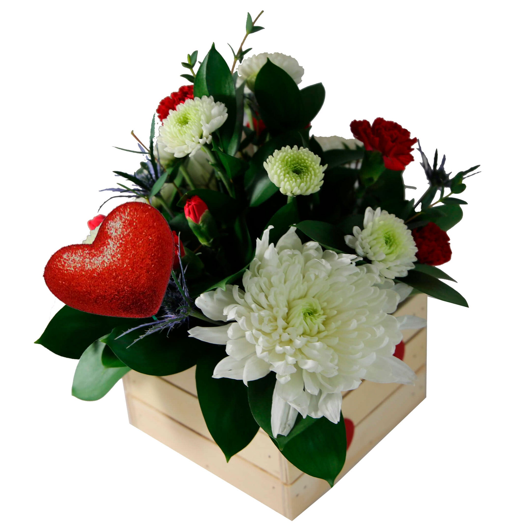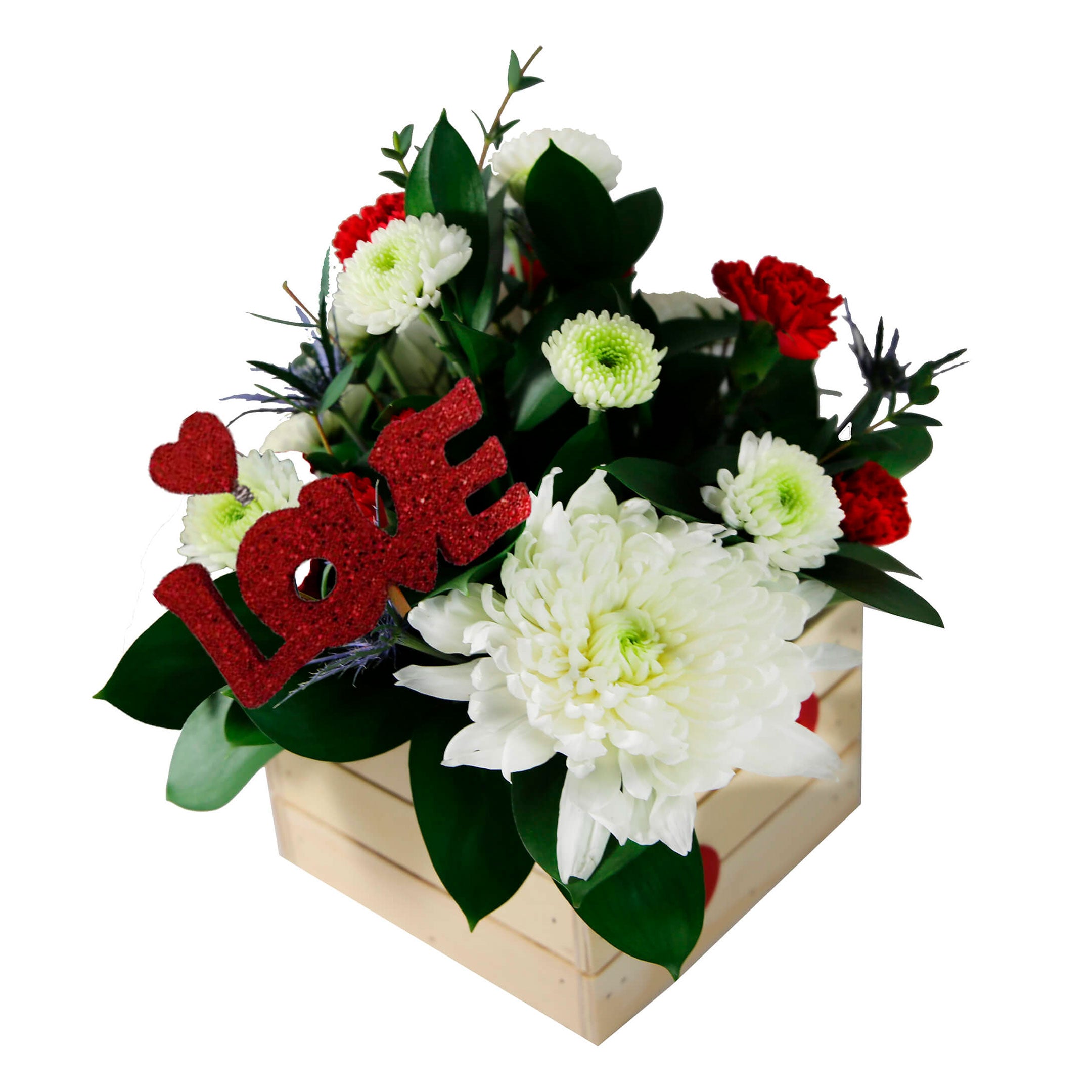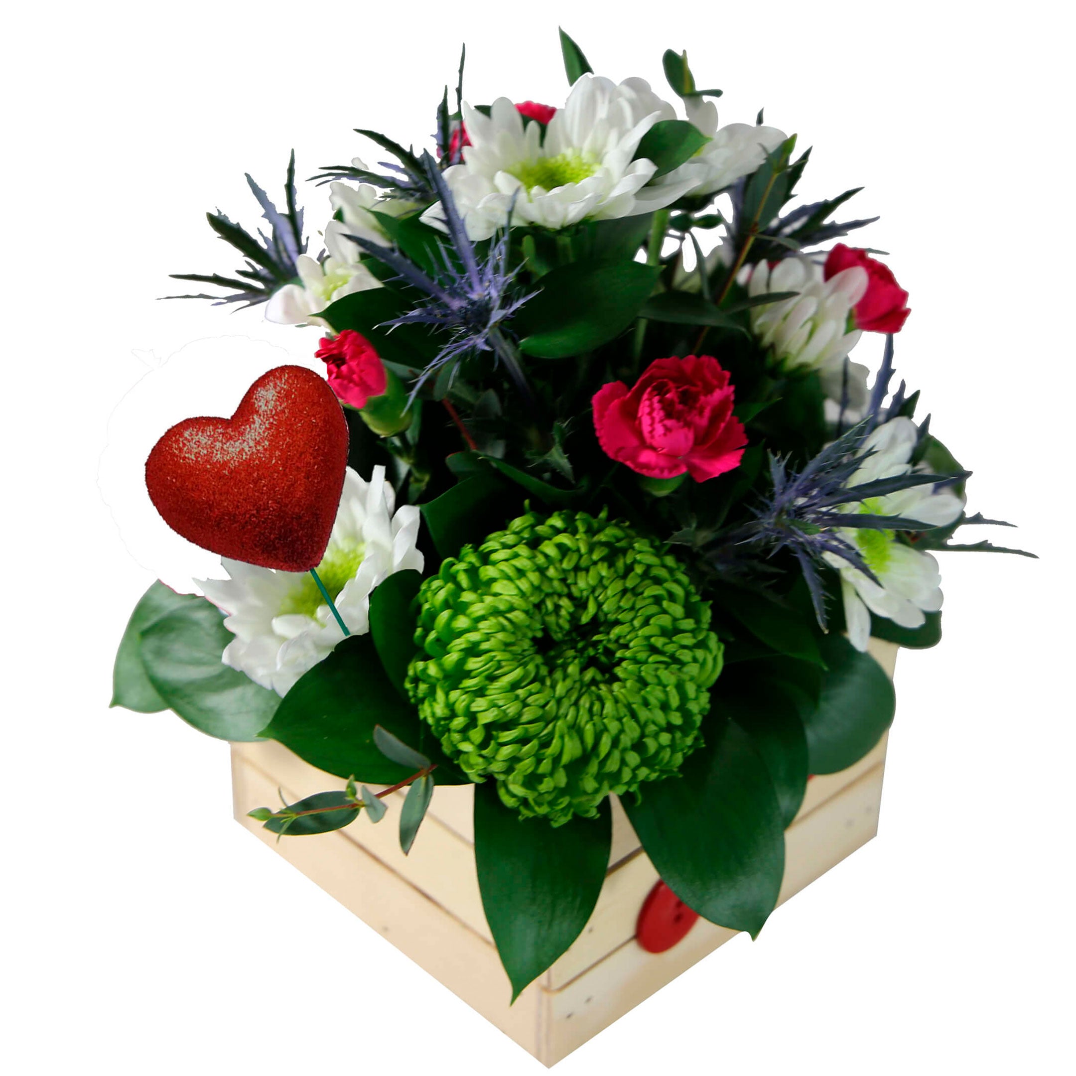 5 Laterals Mini Carnations, 8 Laterals Buttons/Novelty Poms, 2 Disbuds, 6 Laterals Eryngium, 8 Laterals Ruscus, 13 Laterals Parvifolia & 1 Seasonal Pick, Liner.
