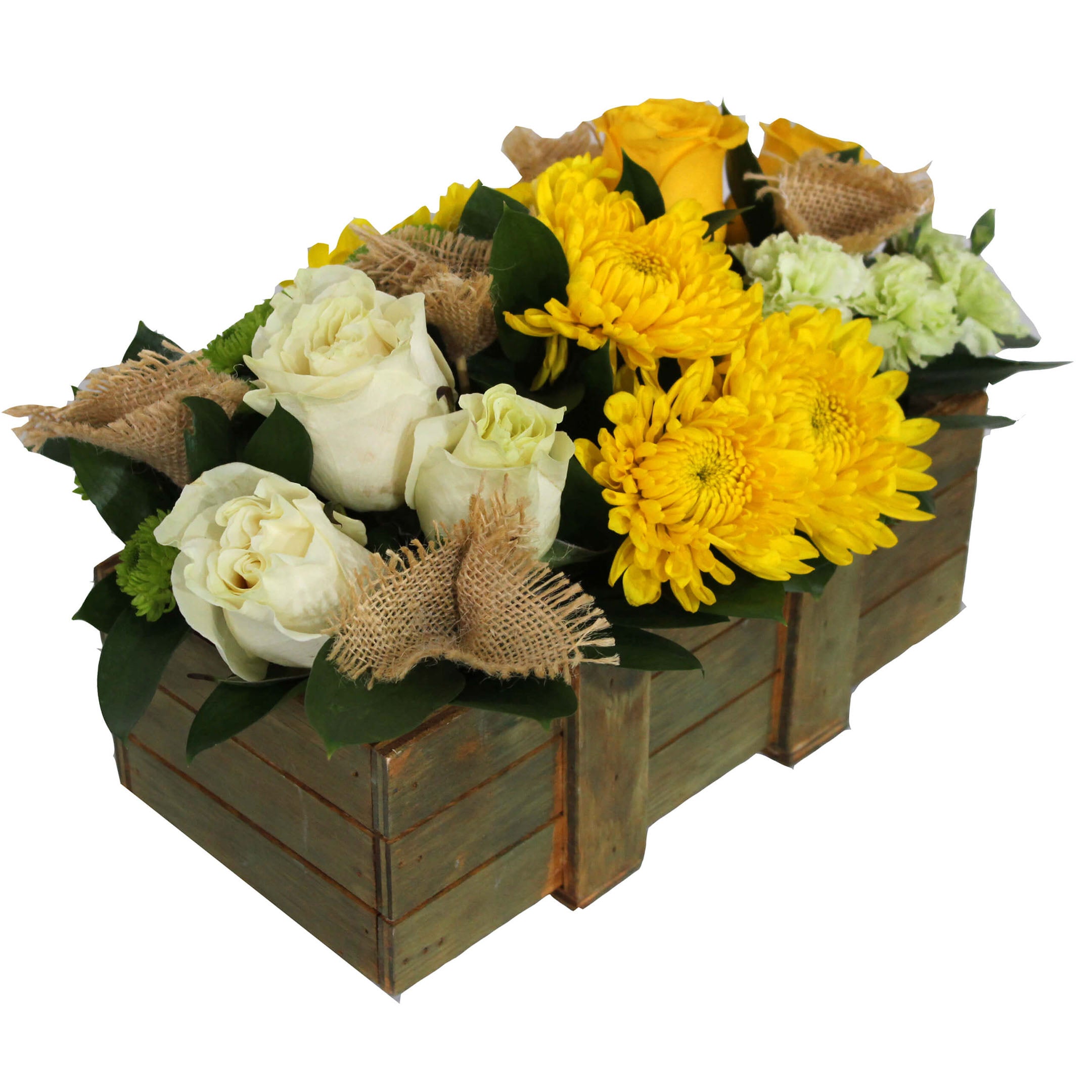 6 Roses, 3 Disbuds, 6 Daisy, 6 Buttons, 4 Mini Carnation, 7 Burlap Picks, 20 Ruscus, Faded Green Wood Container, Liner.