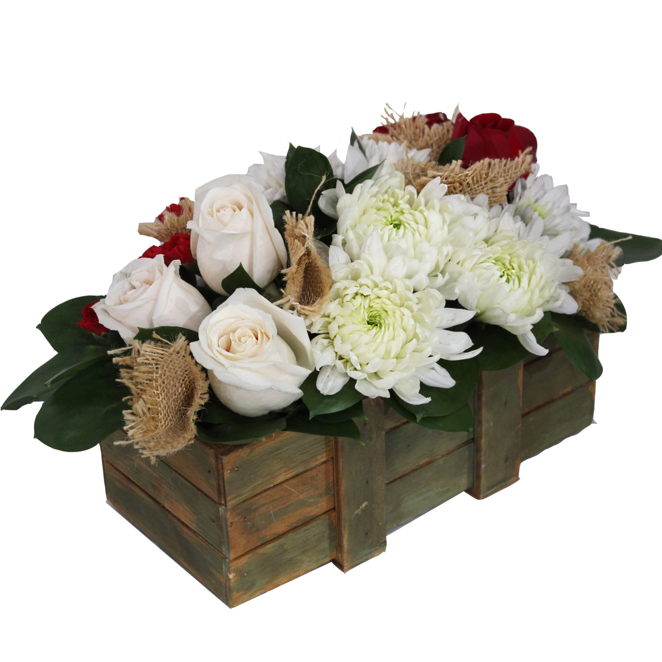 6 Roses, 3 Disbuds, 6 Daisy, 6 Buttons, 4 Mini Carnation, 7 Burlap Picks, 20 Ruscus, Faded Green Wood Container, Liner.