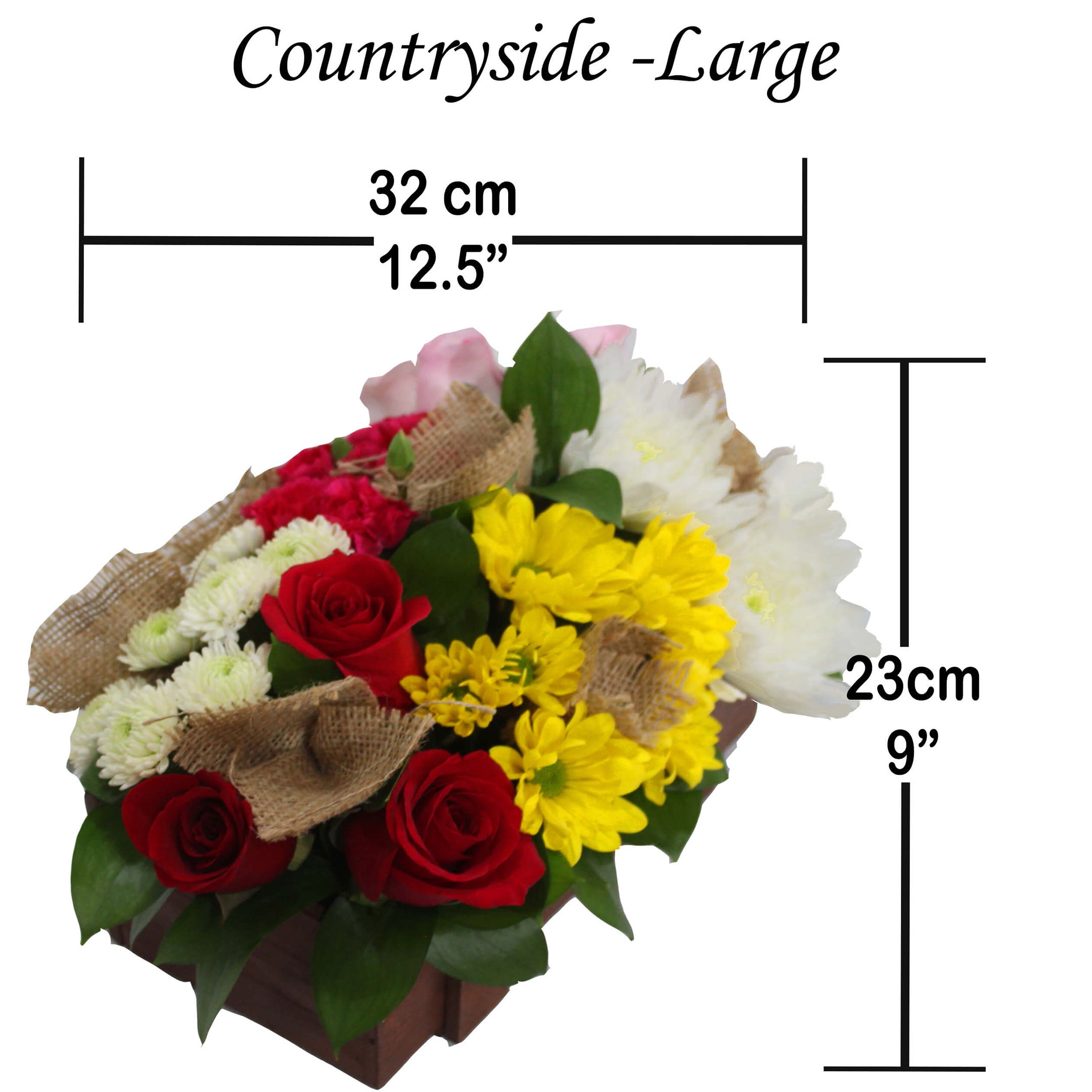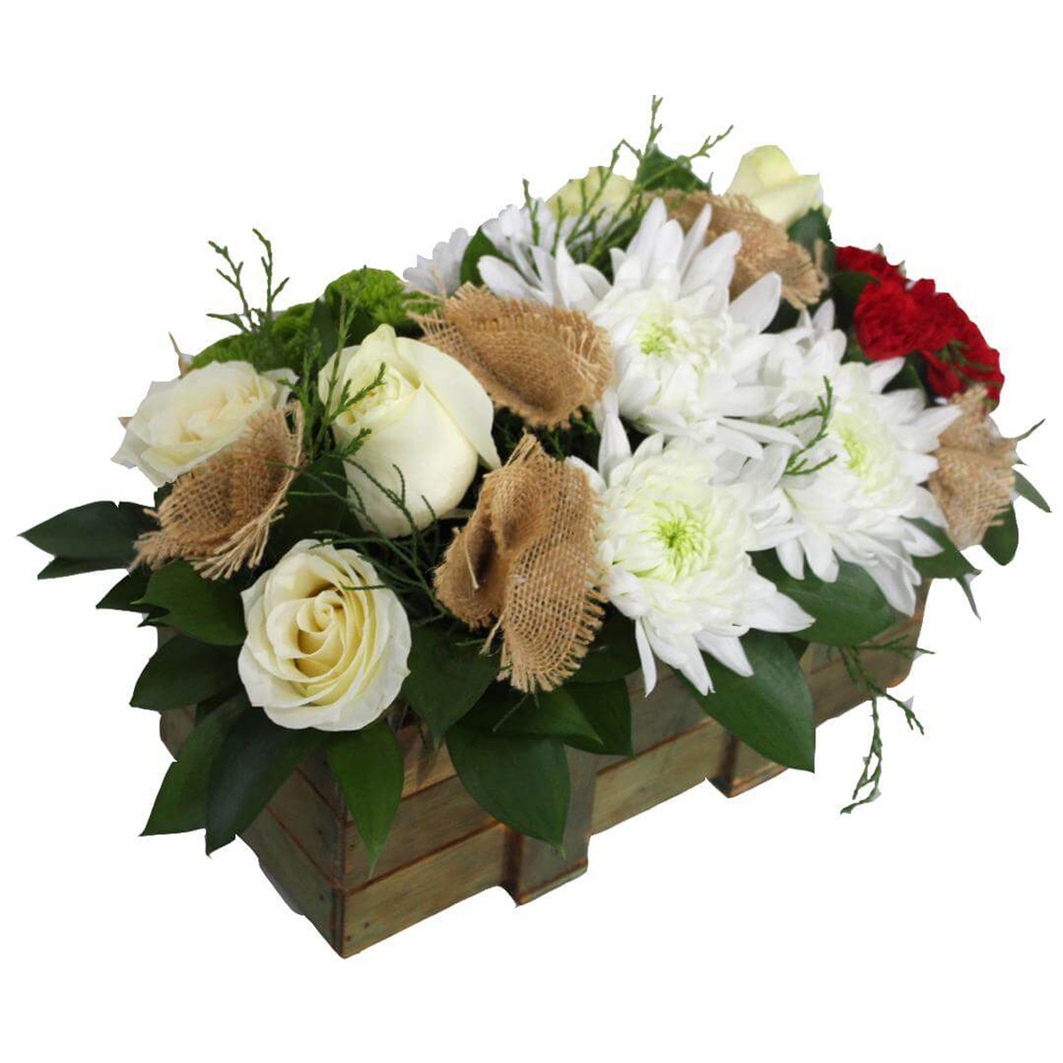 6 Roses, 3 Disbuds, 6 Daisy, 6 Buttons, 4 Mini Carnation, 7 Burlap Picks, 20 Ruscus, Faded Green Wood Container, Liner.