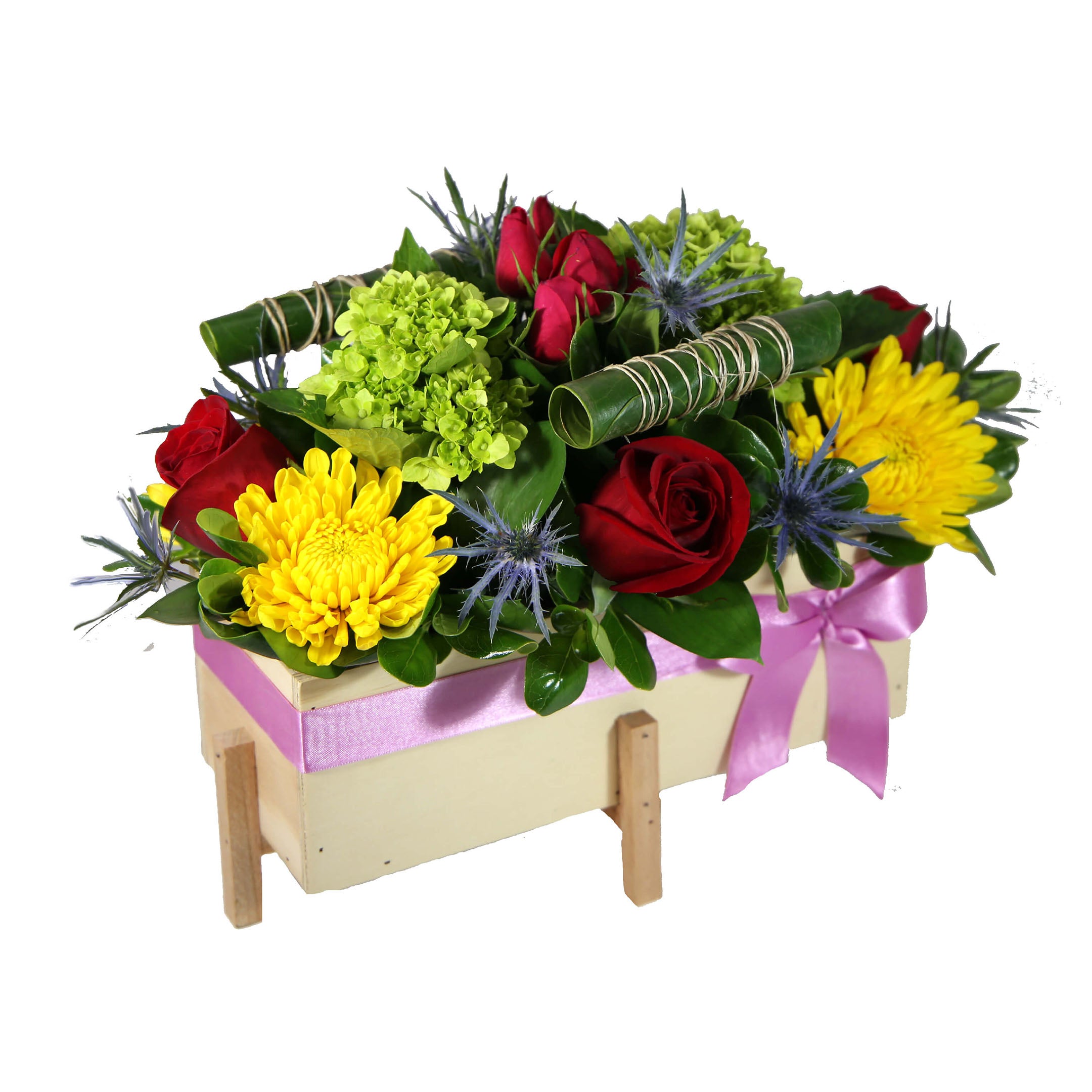 4 Disbuds, 4 Roses, 2 Mini Hydrangeas, 1 Spray Rose, 6 Matsumotos/Eryngiums, 2 Anthurium Leaves (Decorative Wrap in Jute), 11 Ruscus, 13 Brillantina, Special Wood Container with seasonal color ribbon, plus liner.