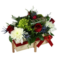 4 Disbuds, 4 Roses, 2 Mini Hydrangeas, 1 Spray Rose, 6 Matsumotos/Eryngiums, 2 Anthurium Leaves (Decorative Wrap in Jute), 11 Ruscus, 13 Brillantina, Special Wood Container with seasonal color ribbon, plus liner.