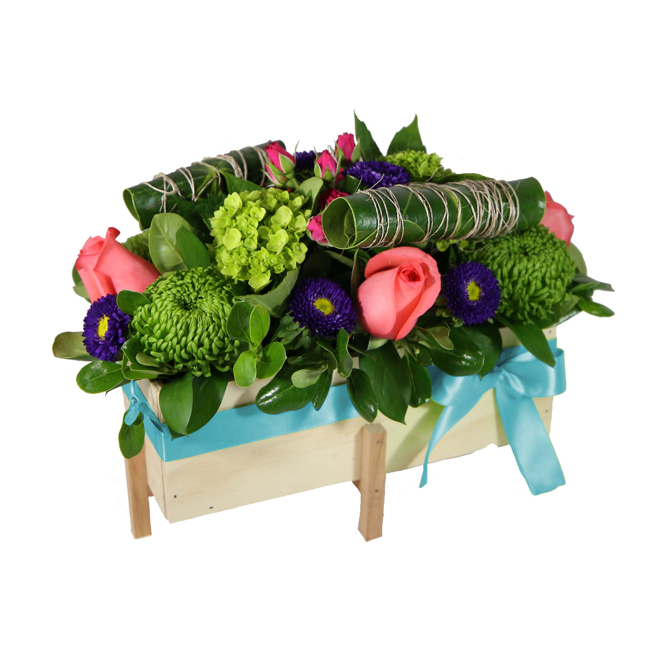 4 Disbuds, 4 Roses, 2 Mini Hydrangeas, 1 Spray Rose, 6 Matsumotos/Eryngiums, 2 Anthurium Leaves (Decorative Wrap in Jute), 11 Ruscus, 13 Brillantina, Special Wood Container with seasonal color ribbon, plus liner.