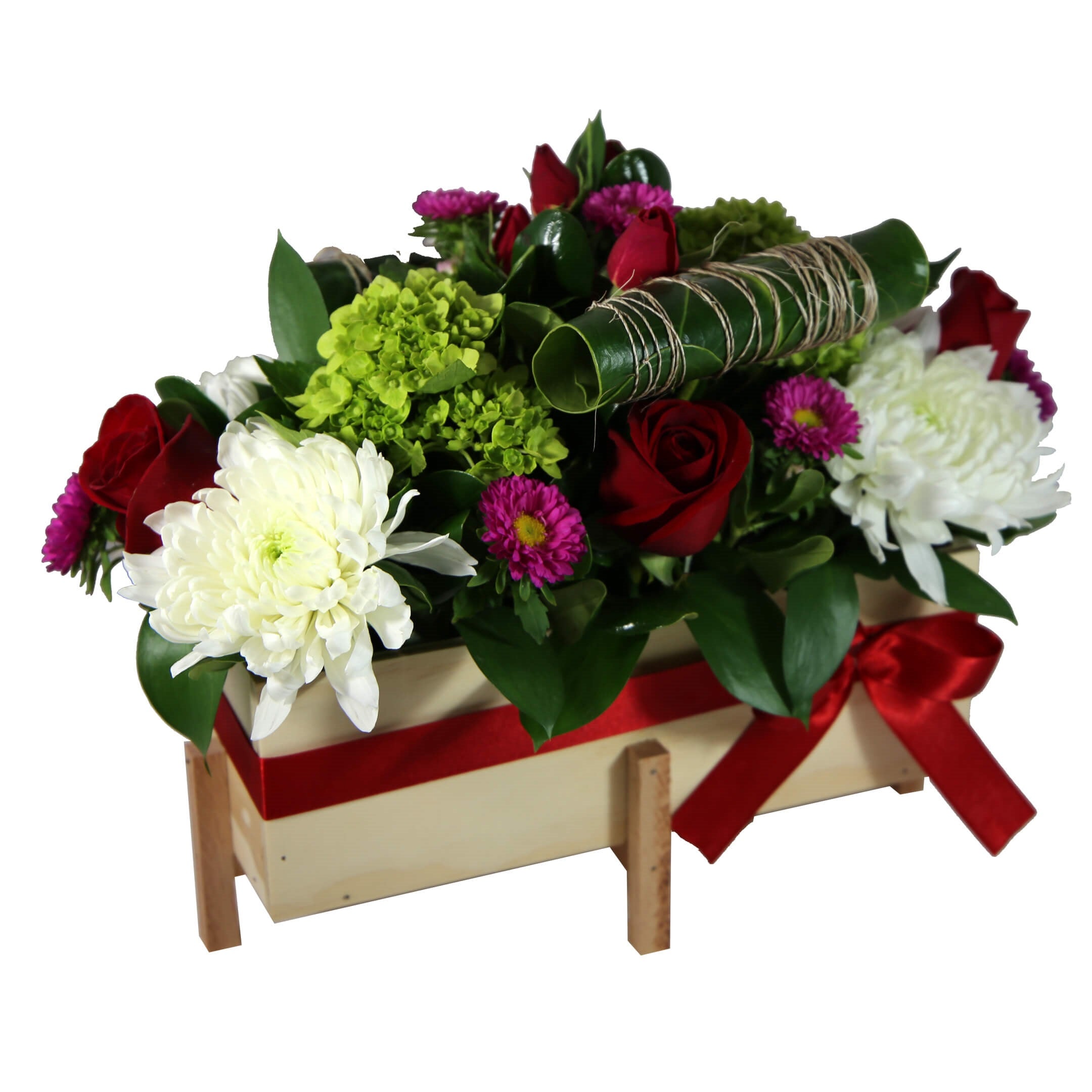 4 Disbuds, 4 Roses, 2 Mini Hydrangeas, 1 Spray Rose, 6 Matsumotos/Eryngiums, 2 Anthurium Leaves (Decorative Wrap in Jute), 11 Ruscus, 13 Brillantina, Special Wood Container with seasonal color ribbon, plus liner.