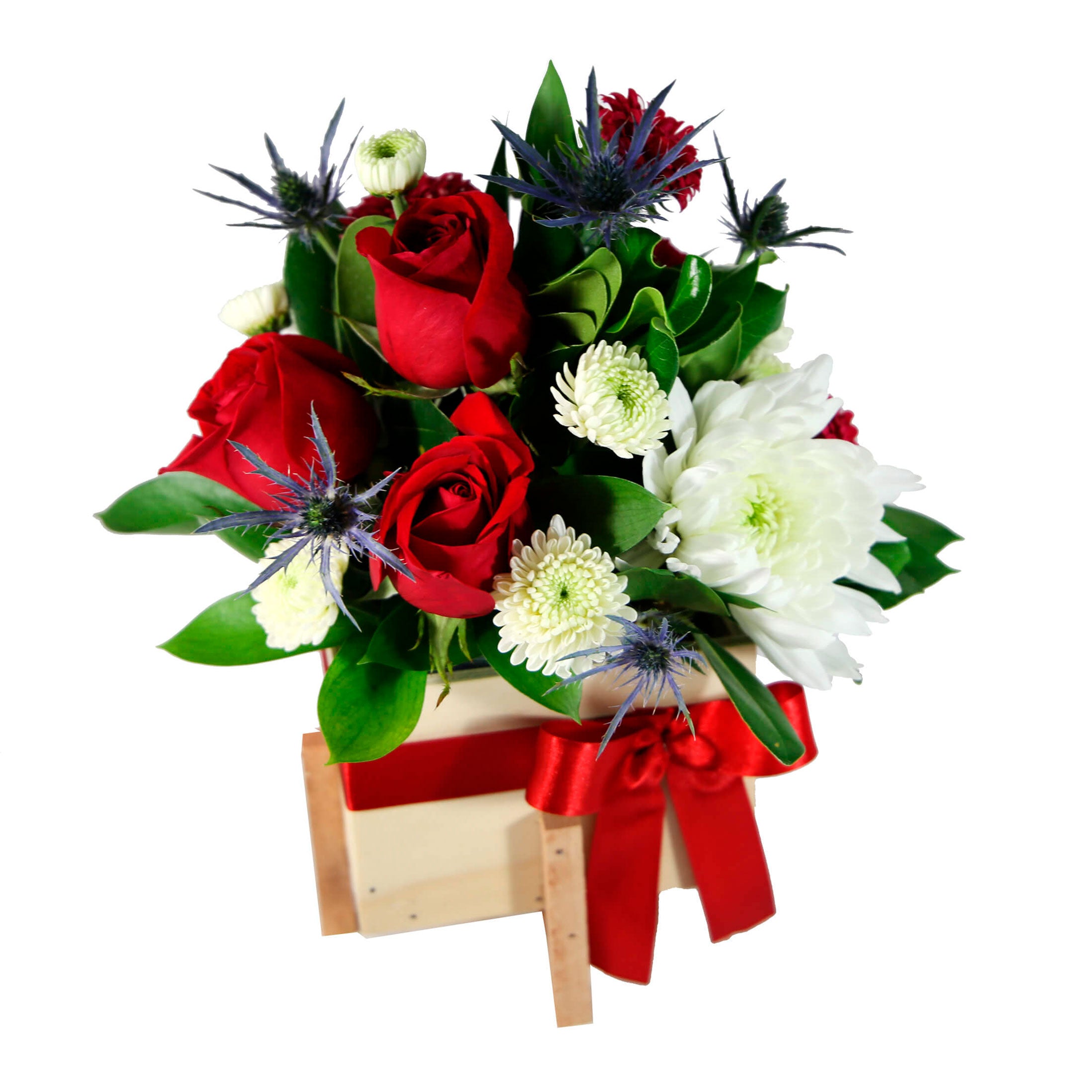4 Roses, 3 Disbuds, 12 Laterals Novelties/Buttons/Micro Poms, 5 Laterals Matsumoto/Eryngium, 8 Laterals Rafines/Eryngium, 8 Ruscus & 8 Green Pittosporum/Brillantina, Wood Container with Liner.