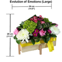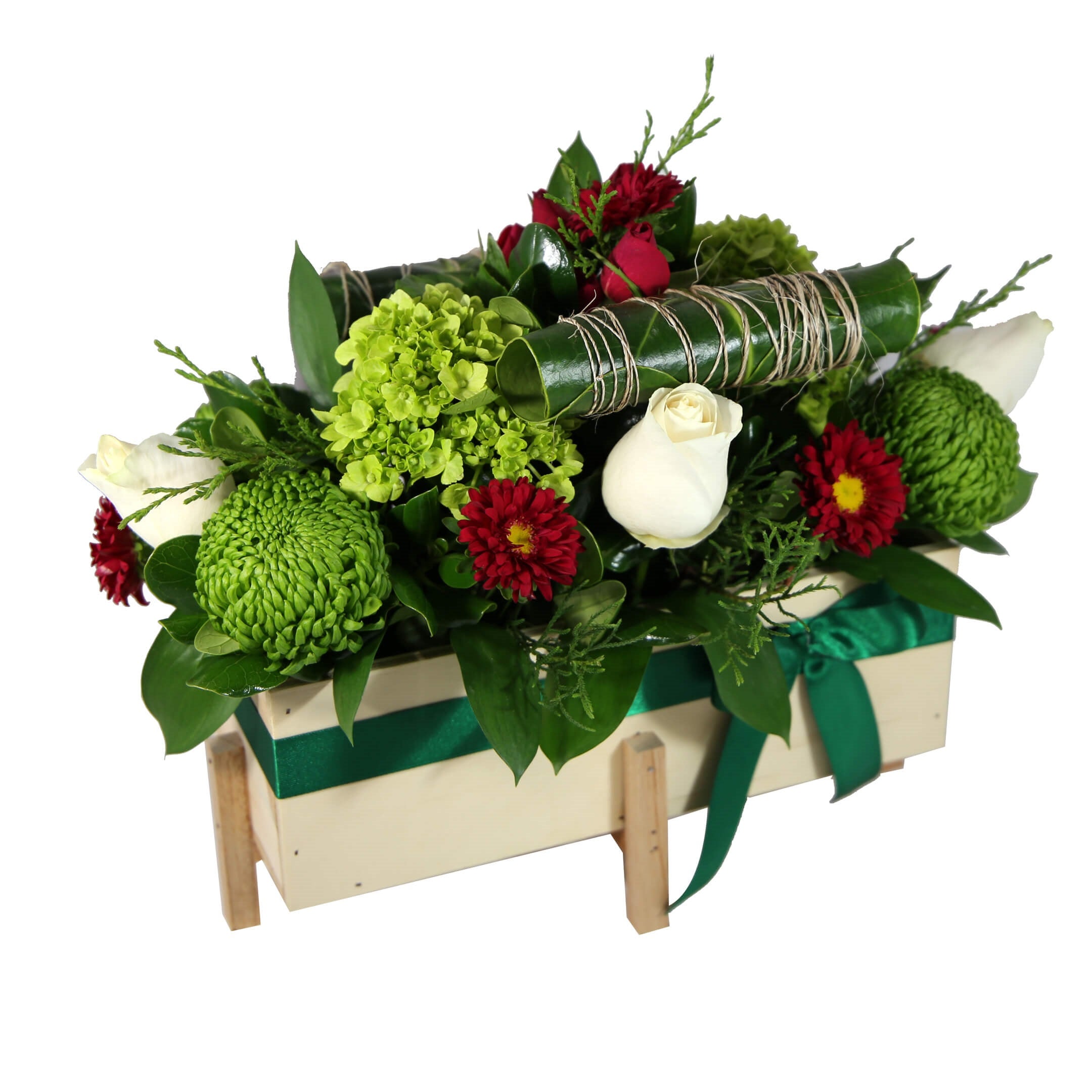 4 Disbuds, 4 Roses, 2 Mini Hydrangeas, 1 Spray Rose, 6 Matsumotos/Eryngiums, 2 Anthurium Leaves (Decorative Wrap in Jute), 11 Ruscus, 13 Brillantina, Special Wood Container with seasonal color ribbon, plus liner.