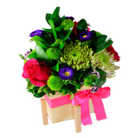 4 Roses, 3 Disbuds, 12 Laterals Novelties/Buttons/Micro Poms, 5 Laterals Matsumoto/Eryngium, 8 Laterals Rafines/Eryngium, 8 Ruscus & 8 Green Pittosporum/Brillantina, Wood Container with Liner.