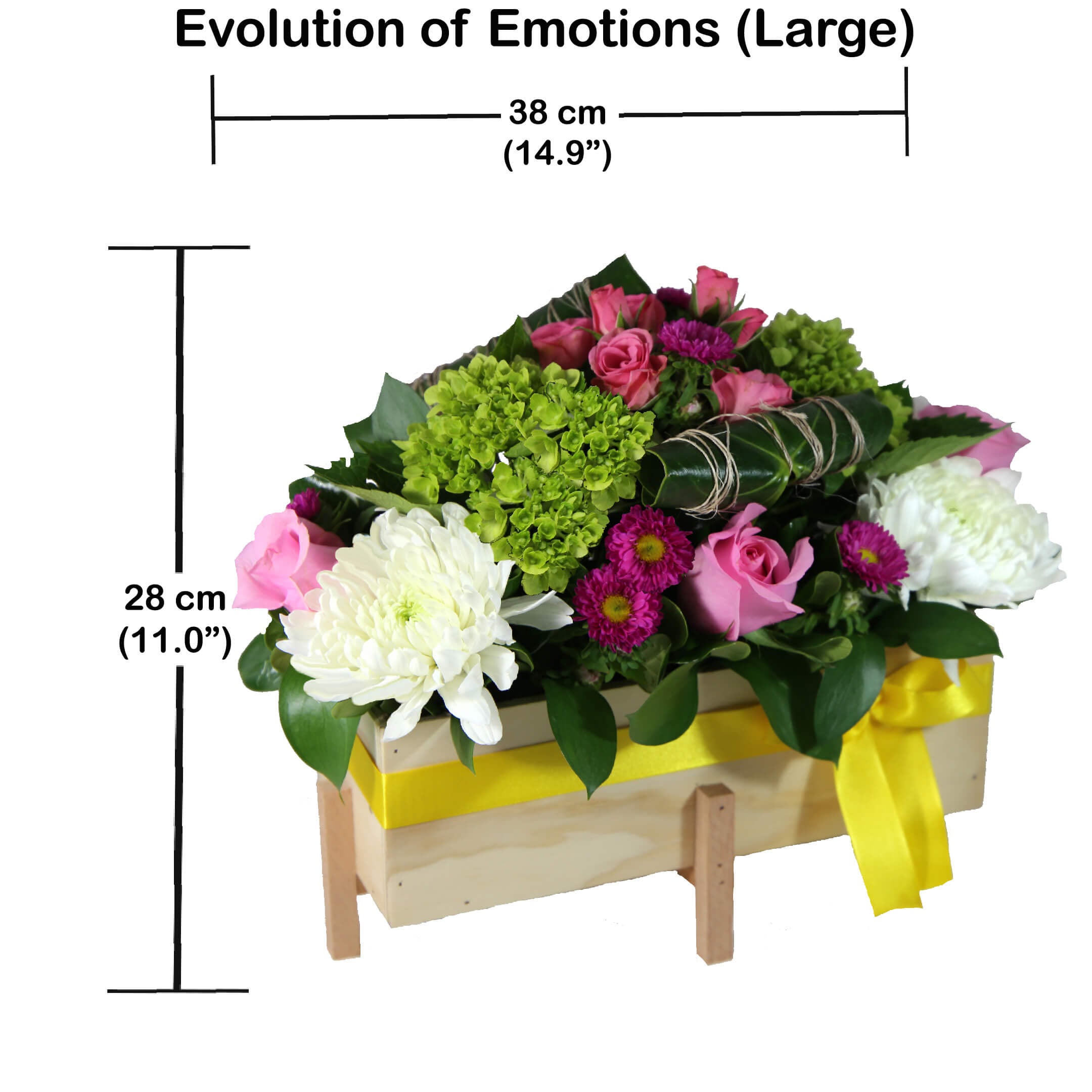 4 Disbuds, 4 Roses, 2 Mini Hydrangeas, 1 Spray Rose, 6 Matsumotos/Eryngiums, 2 Anthurium Leaves (Decorative Wrap in Jute), 11 Ruscus, 13 Brillantina, Special Wood Container with seasonal color ribbon, plus liner.